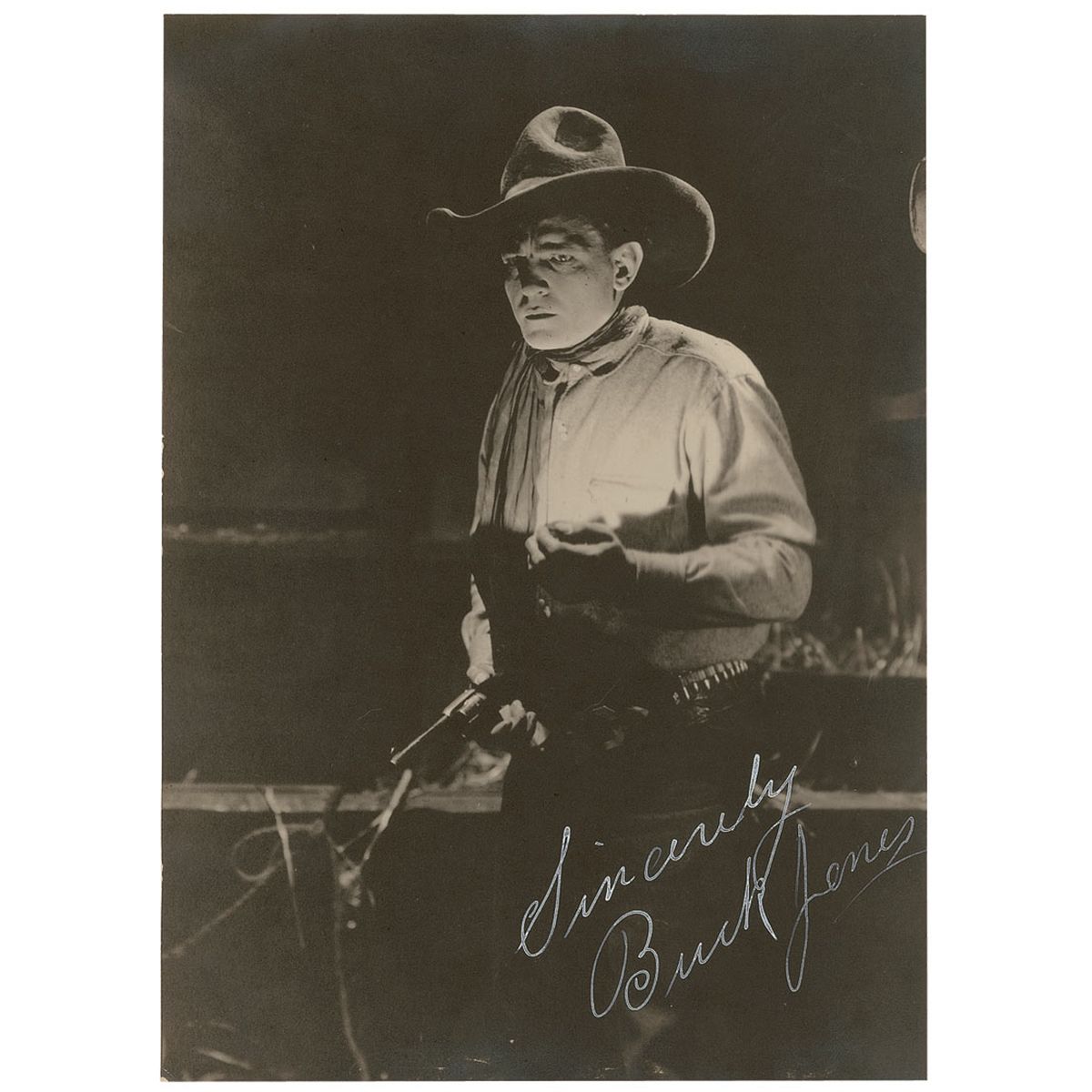 Haunting vintage matte-finish 5 x 7 photo of Jones in cowboy attire with his pistol drawn, signed in white ink, “Sincerely, Buck Jones.” Moderate rippling and silvering to the darker areas of the image, otherwise fine condition.