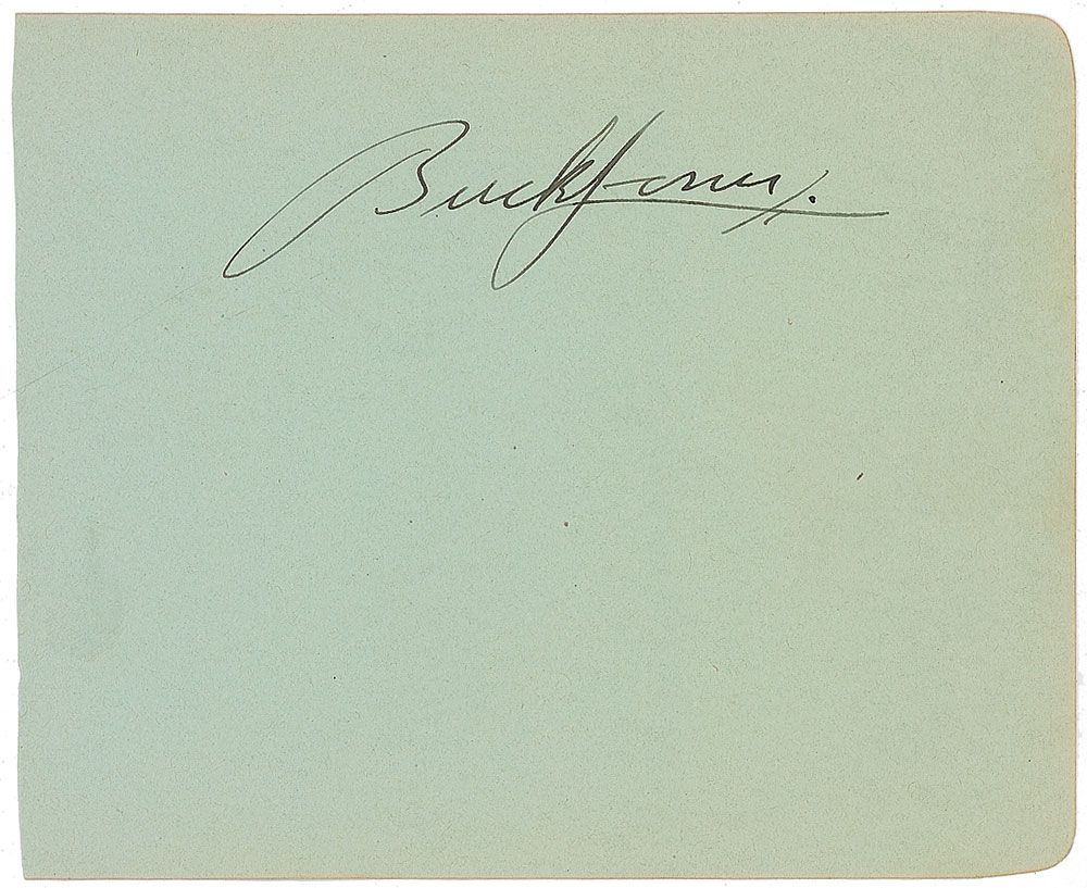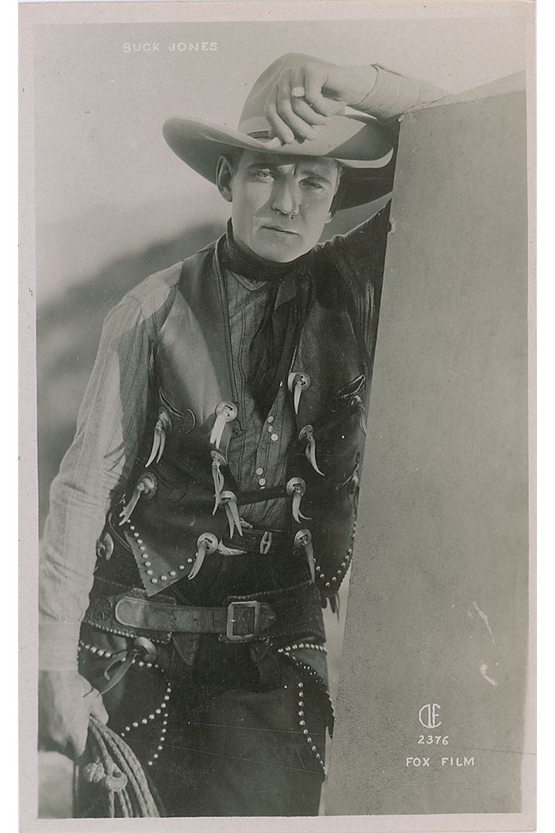 Vintage fountain pen signature, “Buck Jones,” on a light green 5.5 x 4.5 album page. In fine condition, with trivial toning to edges. Accompanied by an unsigned real photo postcard of Jones.