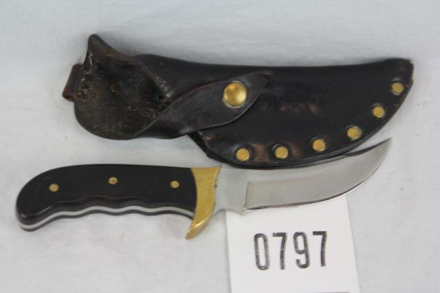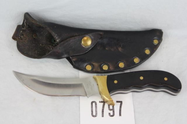 10" overall with 5" blade. Knife is in very good to excellent condition with very light handling marks. Comes with leather sheath.