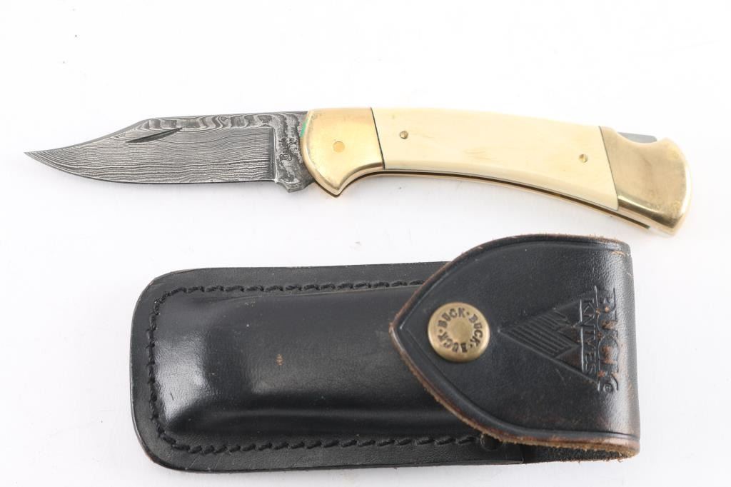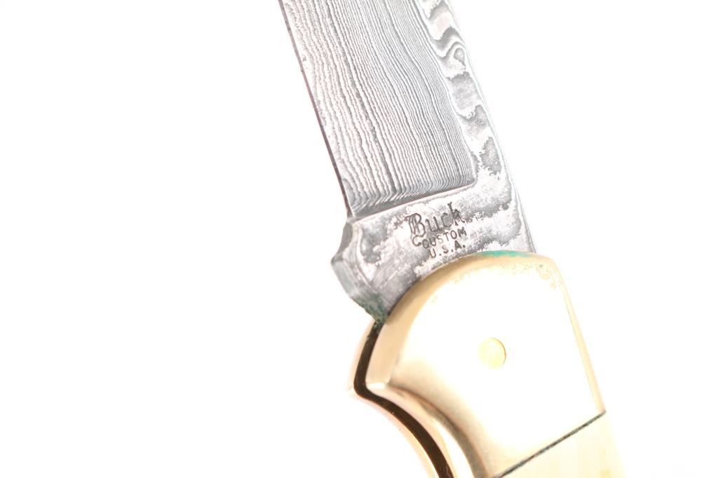 Buck Custom folding knife w/ Damascus steel blade, bone scales and brass bolsters. 2-5/8" blade. 7-1/4" overall length