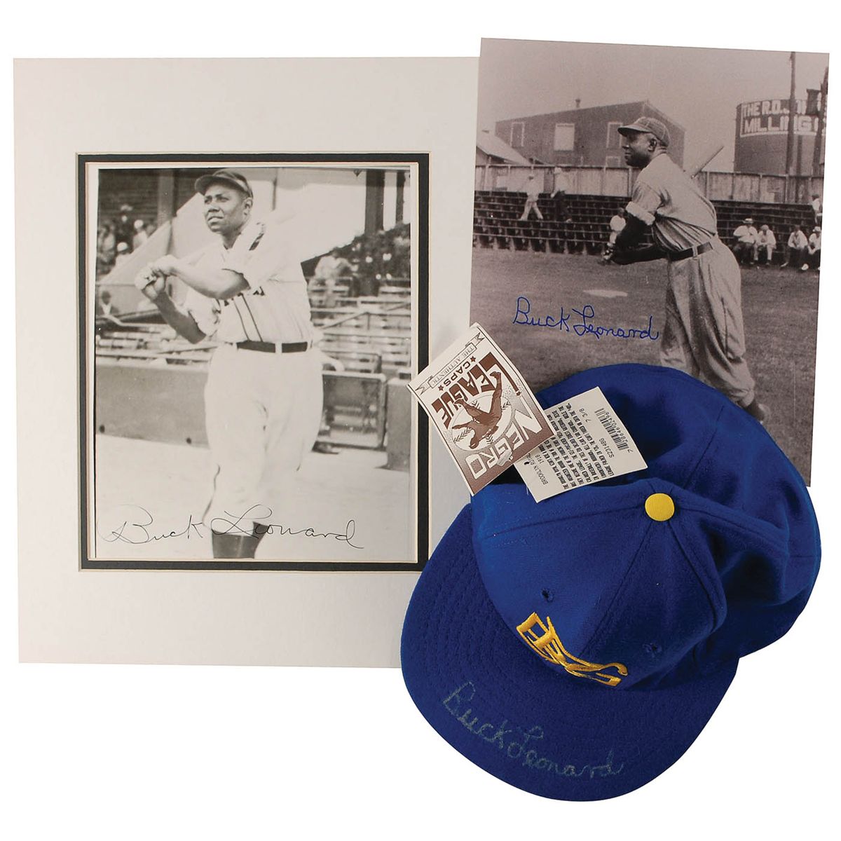 Three items: one replica Brooklyn Royal Giants baseball hat by Roman, signed in silver ink on the brim; one glossy 8 x 10 photo of Leonard taking a practice swing, signed in blue felt tip; and one glossy 7.5 x 9 photo of Leonard warming up, signed in black felt tip and double-matted to an overall size of 11 x 14. In overall fine condition.