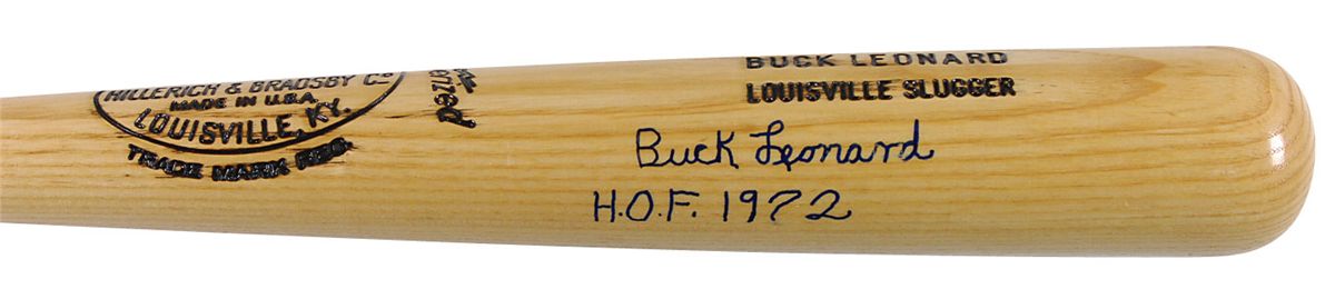 Official Louisville Slugger Buck Leonard model baseball bat signed in blue felt tip on the barrel, “Buck Leonard, H.O.F. 1972.” In fine condition.