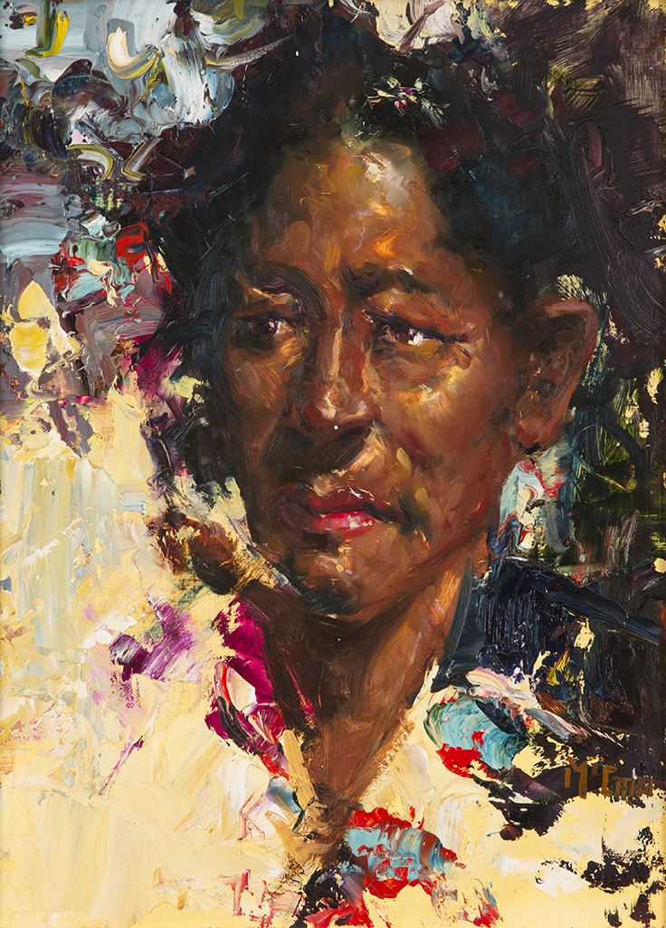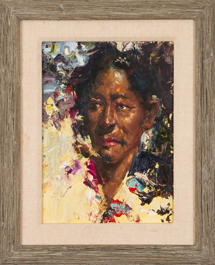 Buck McCain (1943 - ). Navajo Woman. 16" x 12" oil on board. Signed lower right.