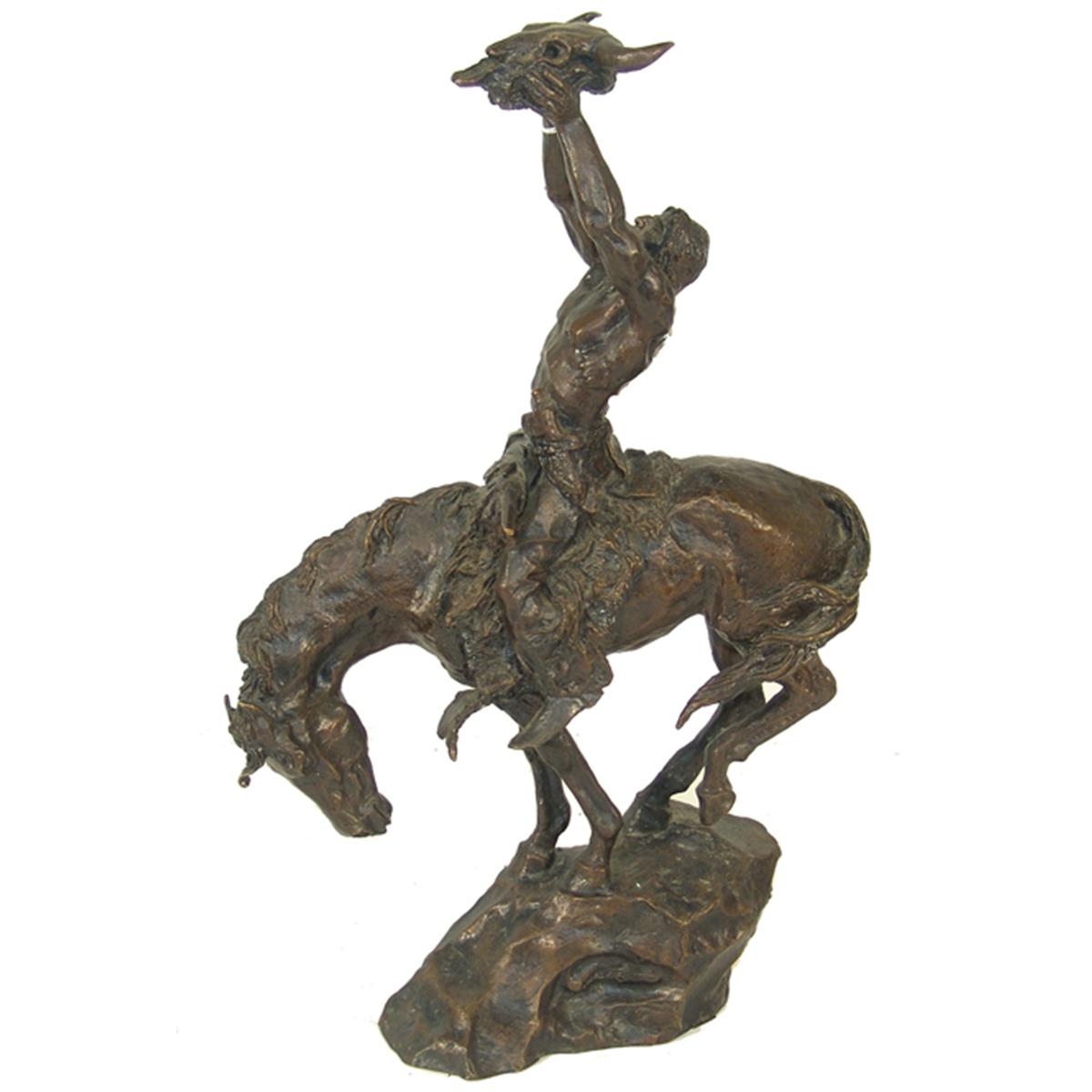 Finely detailed bronze sculpture of a warrior on horseback with bow case and quiver holding a buffalo skull up to the Creator. 16-1/2" x 5" x 12"