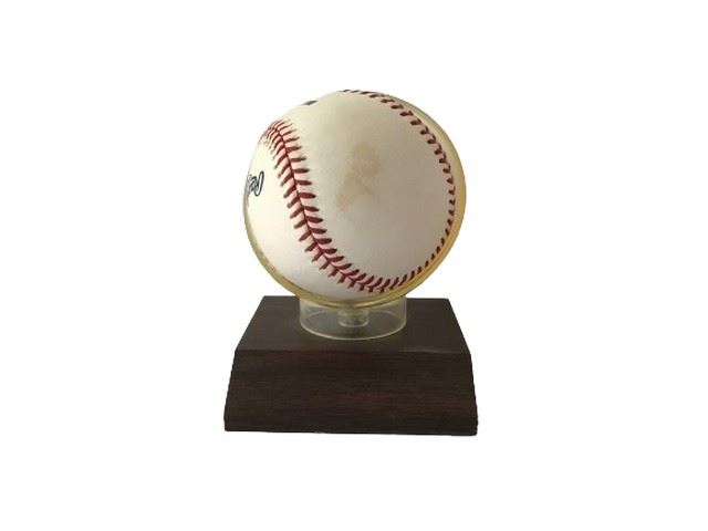 Buck O’Neil autographed baseball mounted on acrylic case and wooden base.