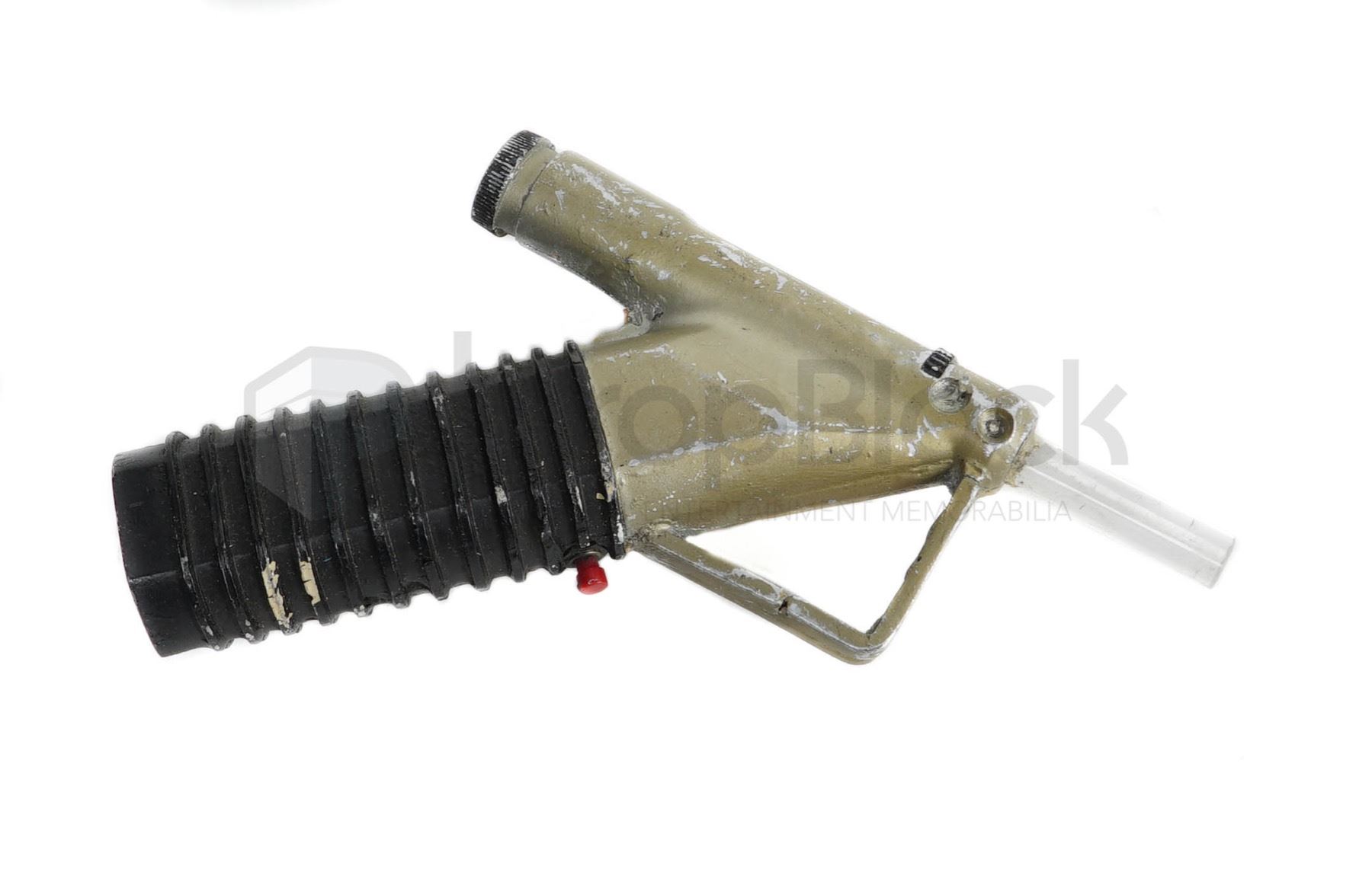 Custom made "laser pistol" used in the science fiction series Buck Rodgers in the 24th Century. This is piece was used by various actors on the show and is a hero prop. Made from cast resin and fiberglass, this piece is silver and black in color, with a depressible red trigger button and clear acrylic emitter tip. The electronics are untested and it is unknown if in working condition. This piece includes a clear holster with gold buckle attachment (not pictured) and remains in excellent, production used condition.