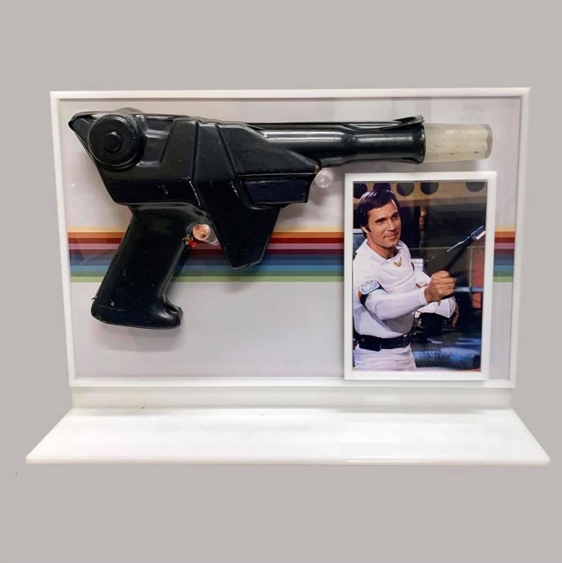Hero blaster used by Buck Rodgers, actor Gil Gerard in the science fiction television series Buck Rodgers in the 24th Century. A 20th century astronaut emerges out of 500 years of suspended animation into a future time to become Earth's greatest hero. This hero version is vacuformed with working electronics and a push button on the handle. This piece features a clear acrylic tip and shows slight wear from use in the production. This piece remains in excellent, production used condition.