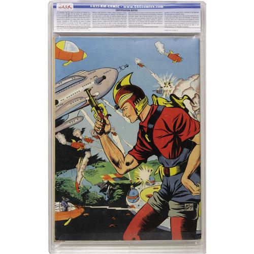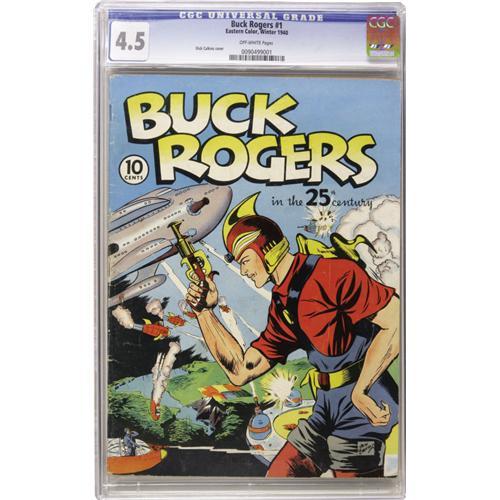 <B>Buck Rogers #1 (Eastern Color, 1940) CGC VG+ 4.5 Off-white pages.</B></I> Only one of the few copies of this issue that have been certified by CGC to date has graded over VG/FN 5.0. You can hardly blame kids for thumbing through these Buck Rogers yarns again and again -- the Sunday strips reprinted here were great reads. The cover is by Dick Calkins. Overstreet 2006 VG 4.0 value = $620. CGC census 10/06: 1 in 4.5, 2 higher.<BR><BR><b>Shipping:</b> Slabbed Comic (<a target="_blank" href="http://www.heritageauctions.com/common/shipping.php">view shipping information</a>)