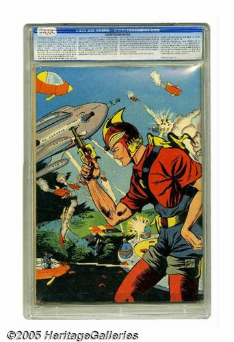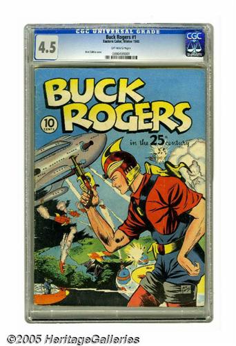 <B>Buck Rogers #1 (Eastern Color, 1940) CGC VG+ 4.5 Off-white pages.</B></I> Guess what, the best known copy of this issue is just half a grade higher at 5.0! You can hardly blame kids for thumbing through these Buck Rogers yarns again and again, the Sunday strips reprinted here were great reads. The cover is by Dick Calkins. Overstreet 2005 VG 4.0 value = $620. CGC census 7/05: 1 in 4.5, 1 higher.
