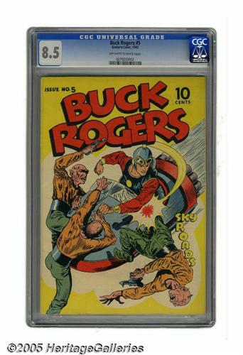 <B>Buck Rogers #5 (Eastern Color, 1943) CGC VF+ 8.5 Off-white to white pages.</B></I> Newspaper strip hero Buck Rogers was a seminal figure in the history of science fiction. Ray Bradbury has often cited the strips as an inspiration, and no doubt many other creators would as well. This issue's story was continued in <B>Famous Funnies</B></I> #80. Only one copy of this issue has been certified with a higher grade by CGC to date. Overstreet 2005 VF 8.0 value = $600; VF/NM 9.0 value = $925. CGC census 3/05: 1 in 8.5, 1 higher.
