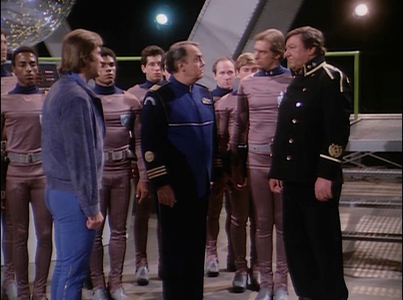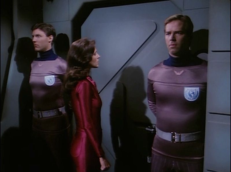 (Universal Studios 1979-1981) This security officer tunic was custom made by the production for use by various actors. The tunic features a Earth Defense Directorate patch on the left chest. Minor wear from use is present.