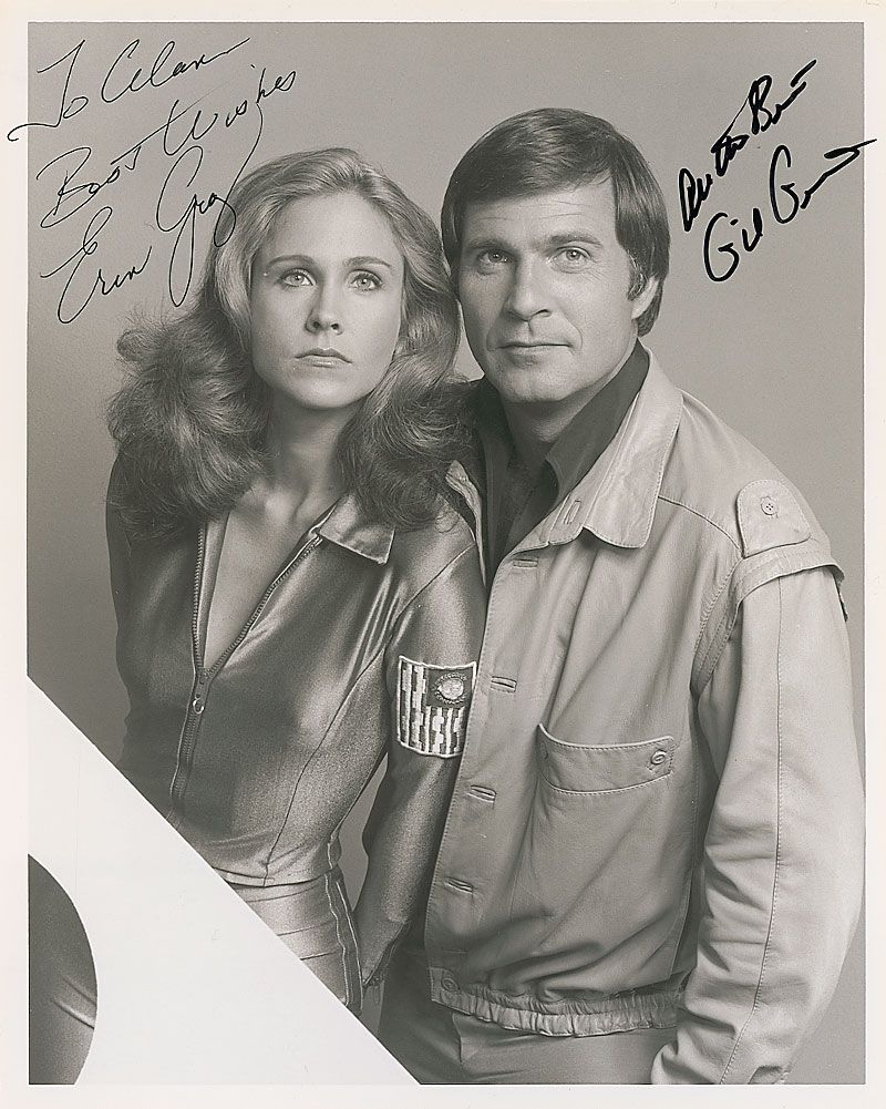 Glossy 8 x 10 photo of Buck Rogers and Col. Deering, signed in black felt tip, “all the best, Gil Gerard,” and signed and inscribed, “To Alan, best wishes, Erin Gray.” In fine condition.