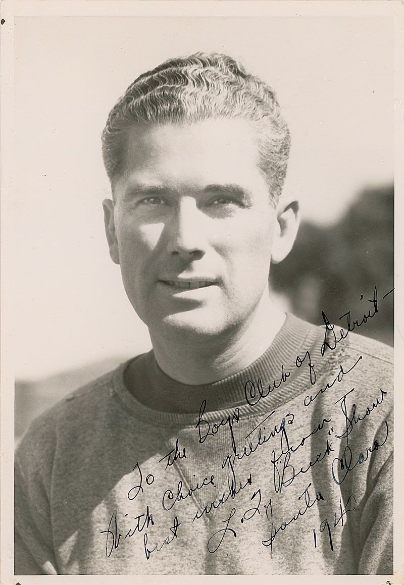 Football player and coach who became a star player on Knute Rockne’s Notre Dame team and later coached for Santa Clara University (1899–1977). Vintage glossy 7 x 10 head-and-shoulders photo of Shaw, signed and inscribed in fountain pen, “To the Boys Club of Detroit—With choice greetings and best wishes from—L. J. ‘Buck’ Shaw, Santa Clara, 1940.” In fine condition, with slight creases and trivial mounting remnants to corner tips.