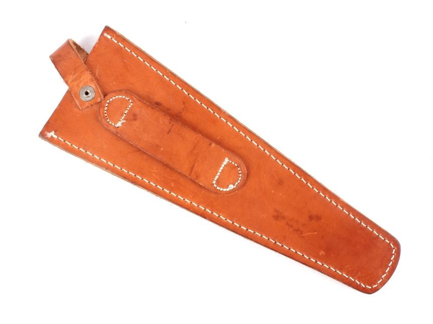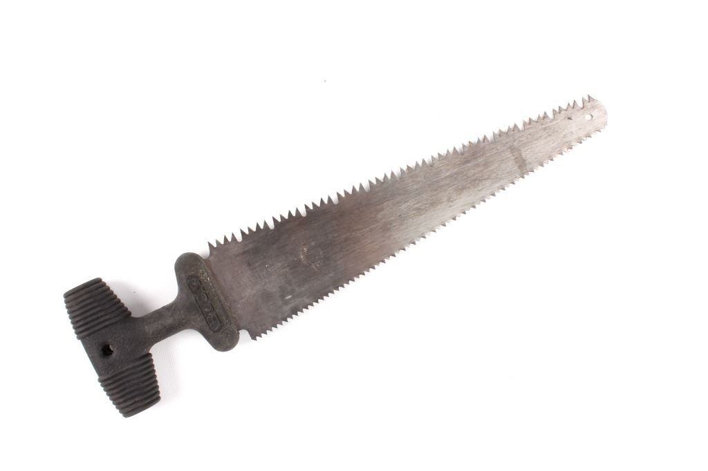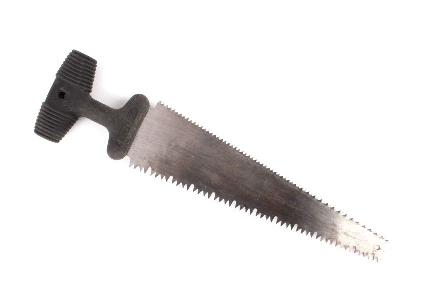 For your consideration is this Buck T handle limb/ bone saw with custom sheath. The sheath is stamped "BUCK' and the button shows Buck Mfg stamp as well. This T handle bone saw shows two teeth type and a rubber wrapped T handle design. The sheath shows a belt loop for easy access. The condition of this saw is good with no obvious signs of damage to the bone saw or the sheath it is shown in.
