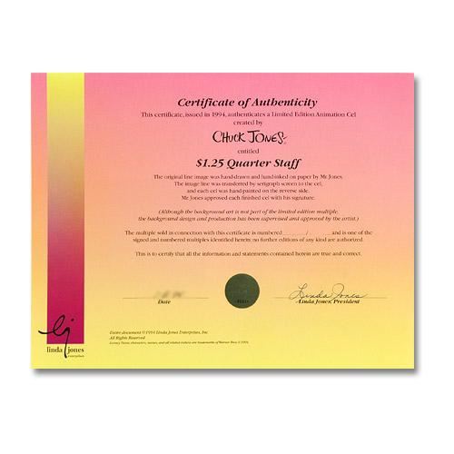 Own this amazing piece based on the original line image hand drawn and hand-inked on paper by Mr. Jones! "Buck and a Quarter Staff" is a sold out limited edition animation cel with hand painted coloring on sericel outline, numbered and hand signed by Chuck Jones (1912-2002). Includes Certificate of Authenticity! Measures approx. 16.5" x 13.5".