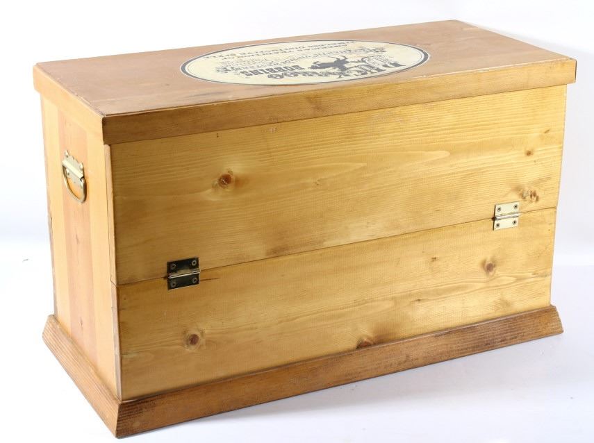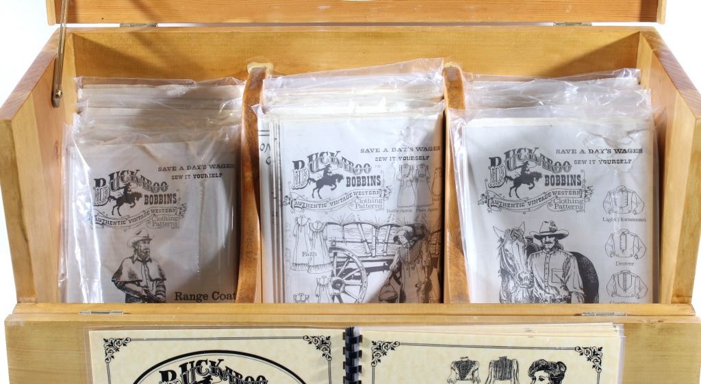 For your consideration in this lot we have a chest display and clothing patterns from Buckaroo Bobbins originating from the 1990's. Buckaroo Bobbins is a sewing and clothing company located in Arizona. The company designs and manufactures clothing patterns for Old Western style clothing. The chest display shows wood construction with a Buckaroo Bobbins sticker across the top reading "Buckaroo Bobbins Authentic Vintage Western Clothing Patterns 1996 America's Tradition of Timeless Distinctive Style". The interior of the lid shows another sticker and instructions on how to get the proper measurements. The front of the chest is hinged to swing down and shows a book of all sold patterns and styles. The storage space shows two wooden dividers with a total of 35 patterns in the chest. The piece shows good condition overall with some light wear. The chest measures 25 1/8" wide by 11" deep and 15 1/4" tall.