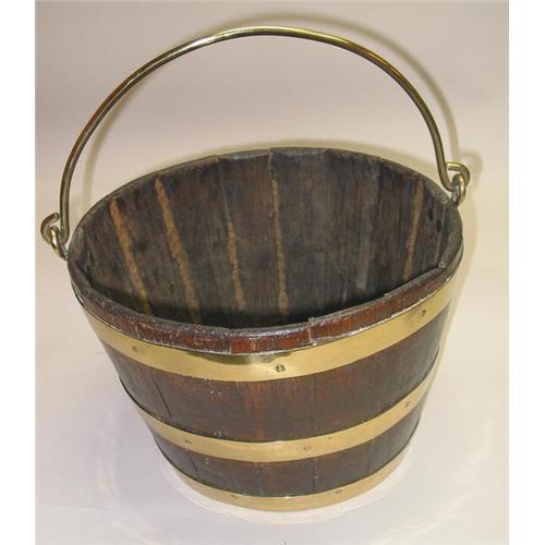 English Oak Brass Banded Farm Bucket with brass handle. 9.5ins high; 14ins diam. The oak staves area is a little loose therefore NOT waterproof.
