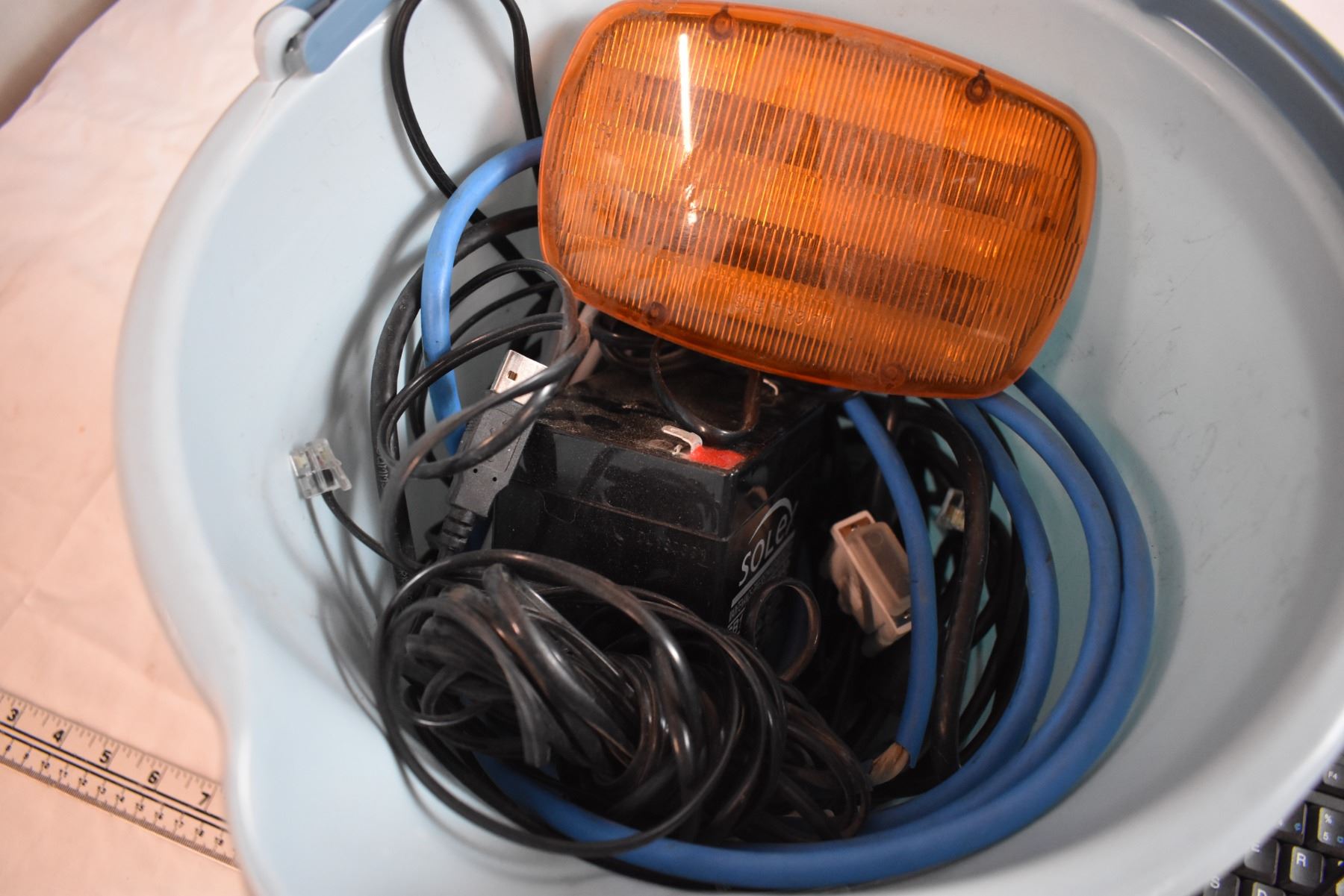 Bucket of Cords, Small Battery, and Keyboard
