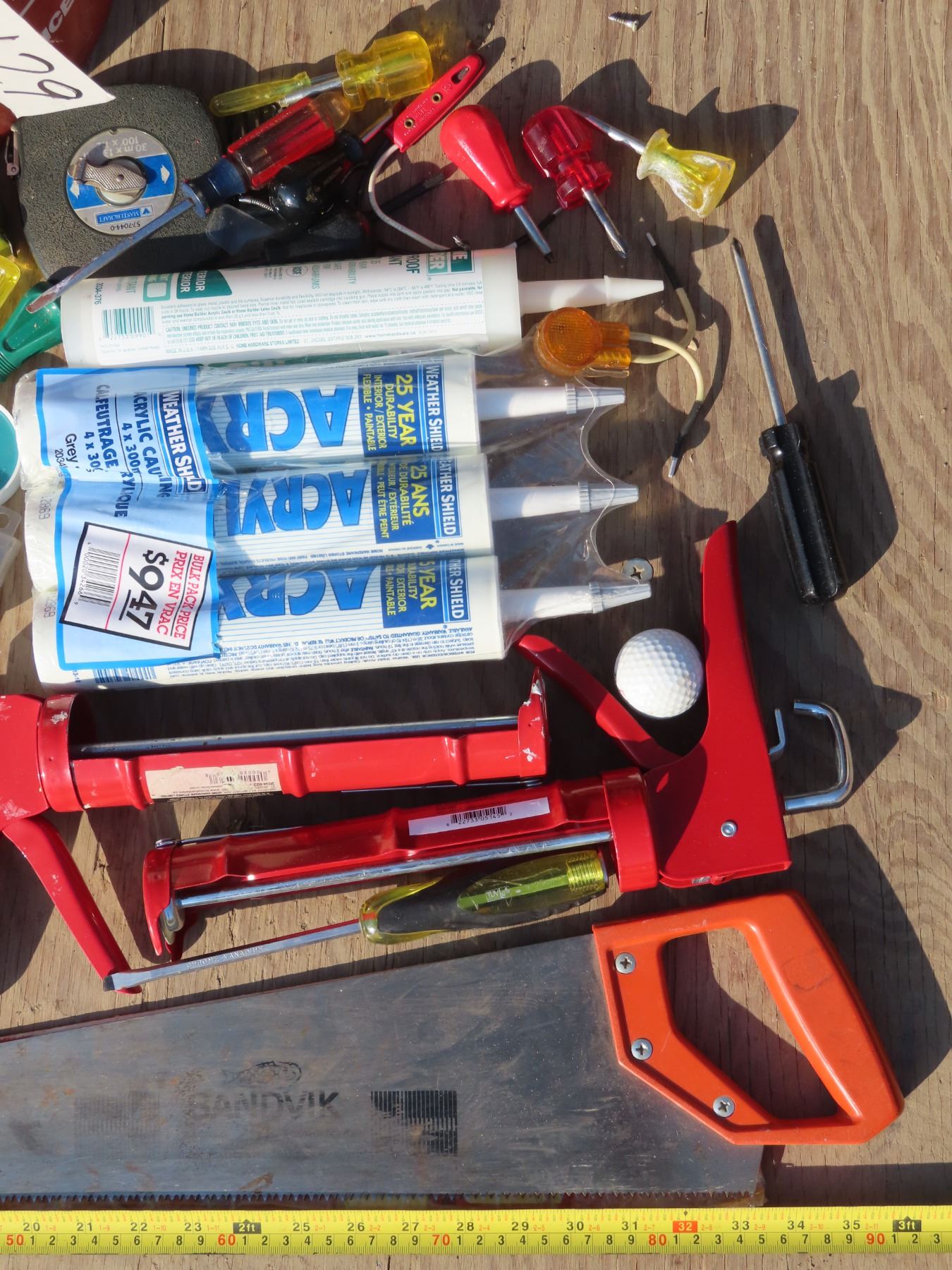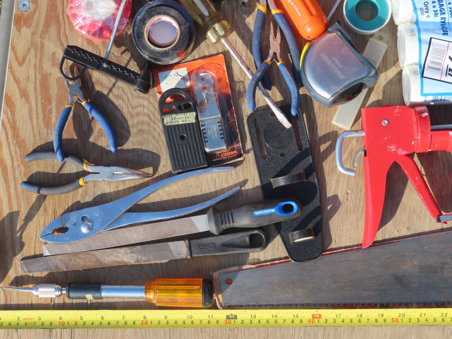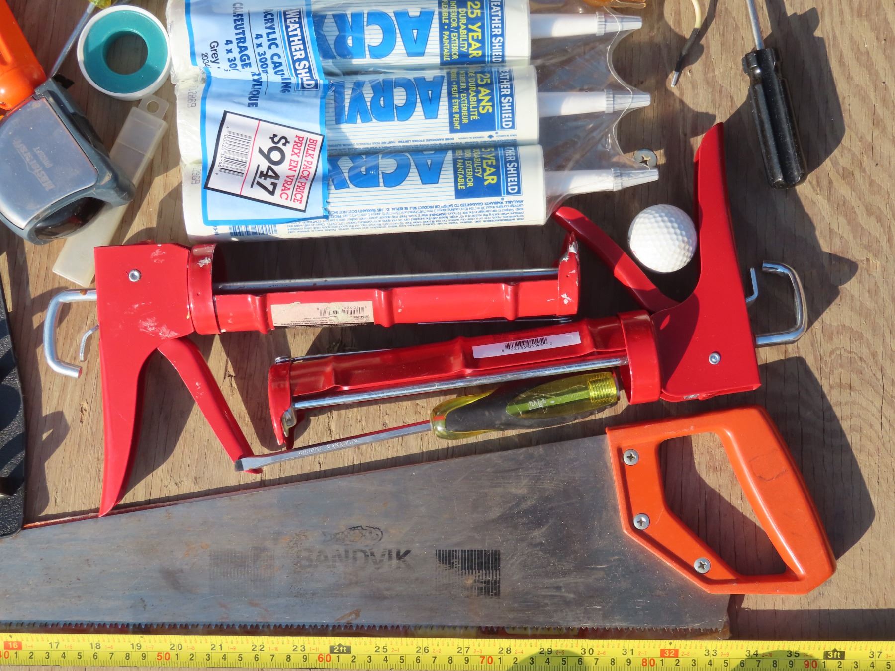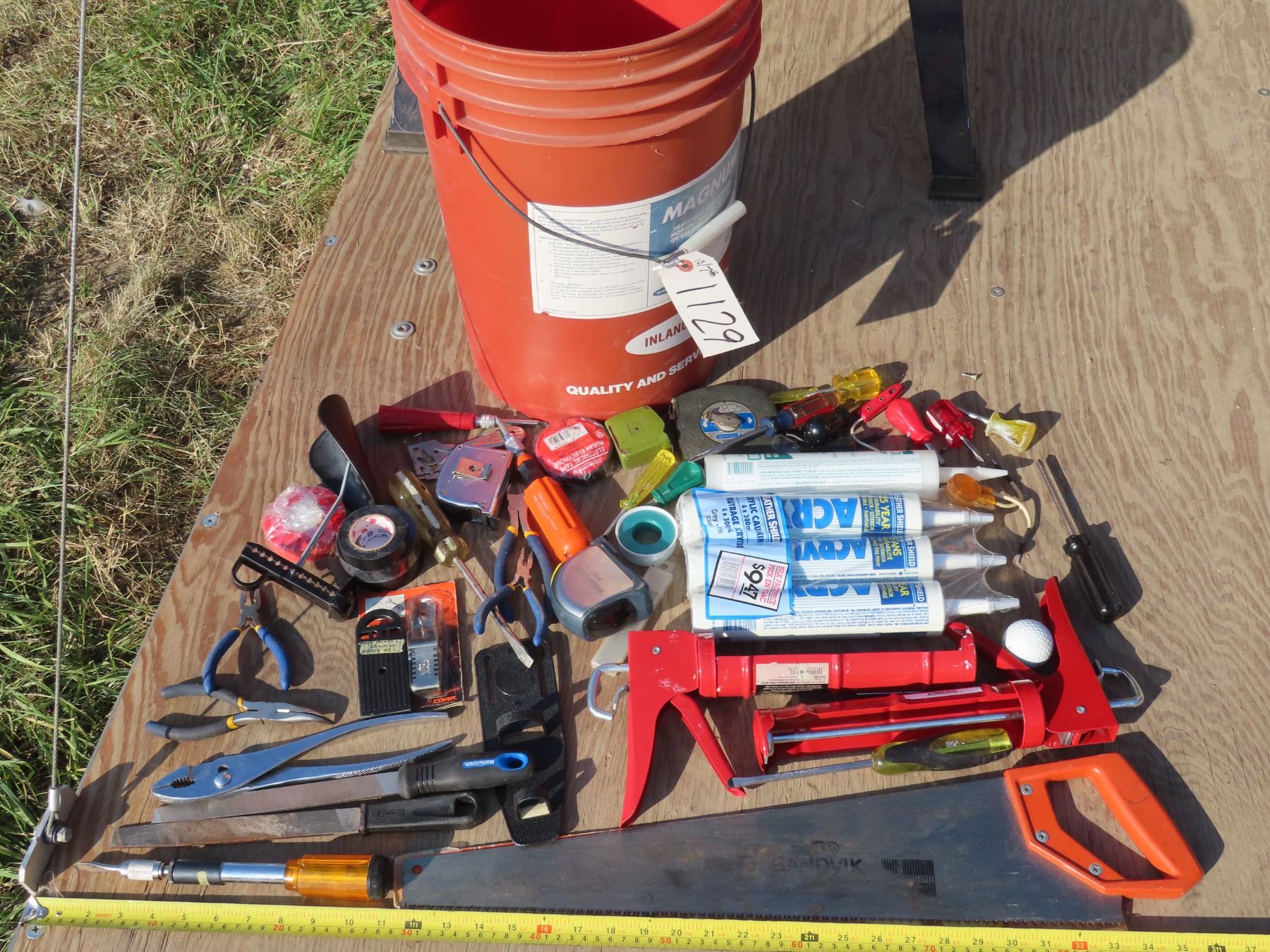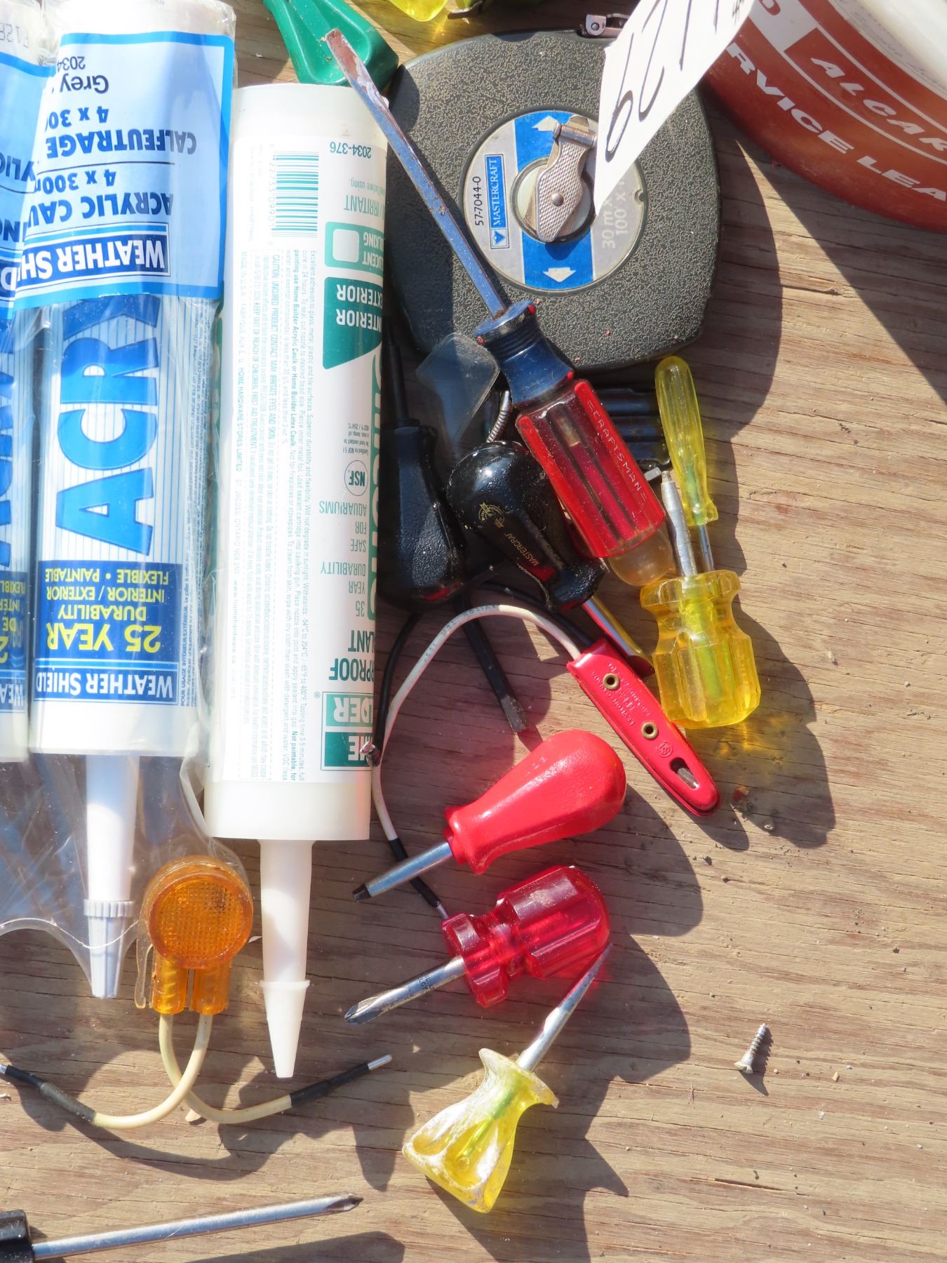 Bucket of misc. tools/caulking guns/tubes/etc.