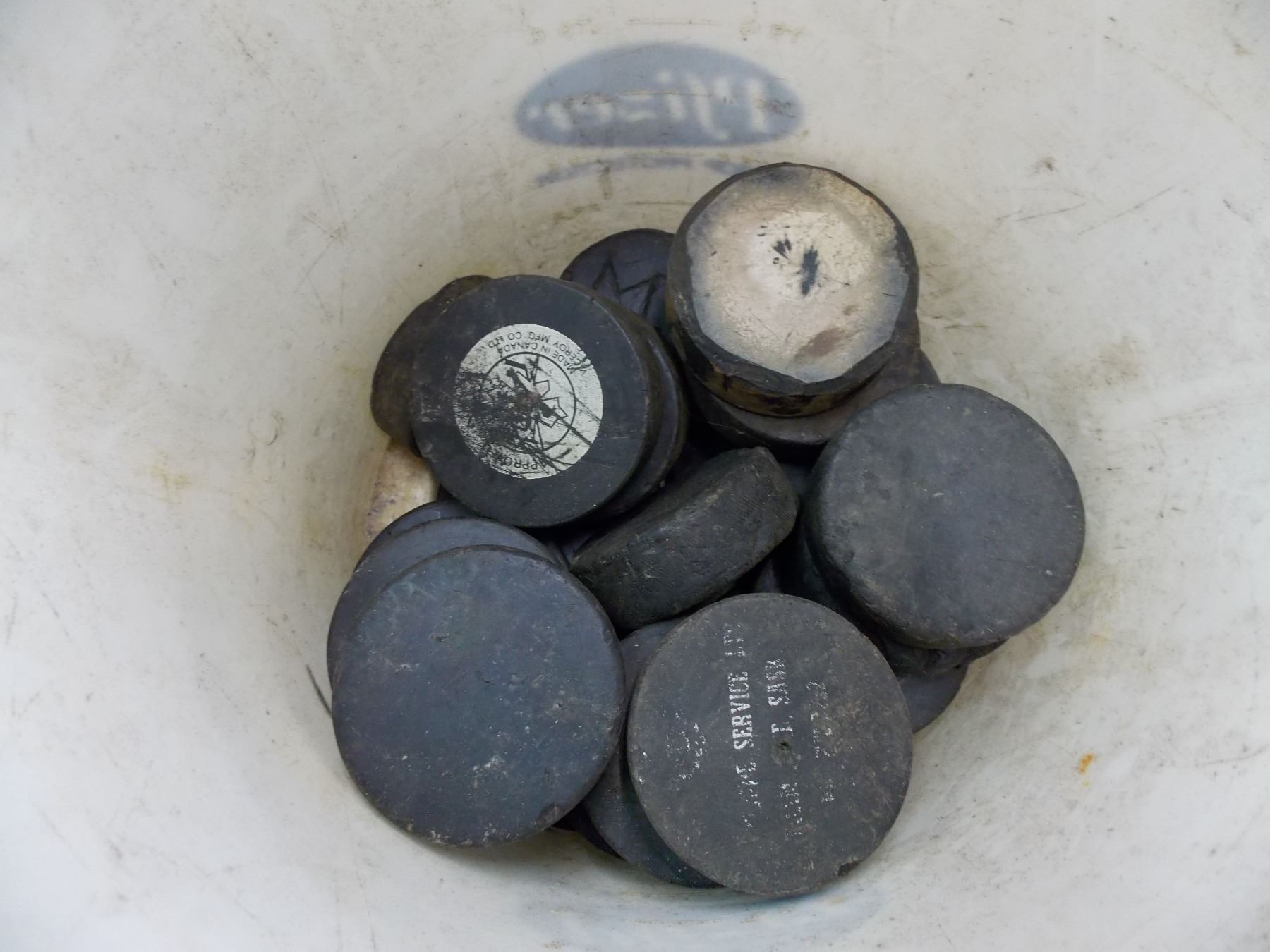 Bucket of old hockey pucks + misc