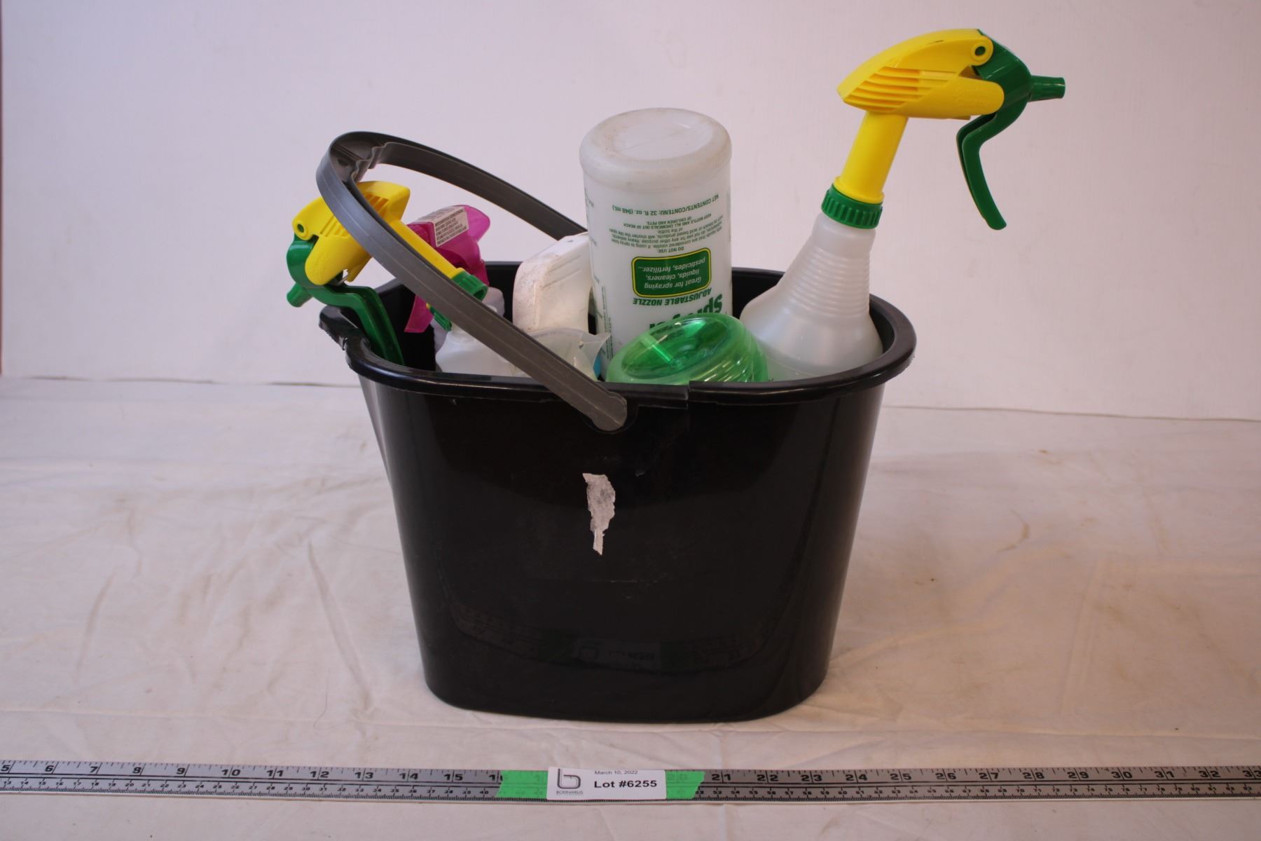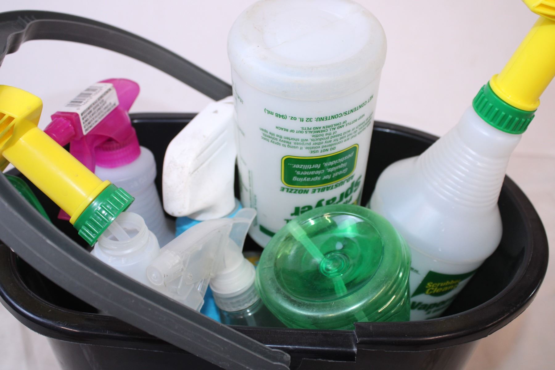 Bucket with various spray bottles