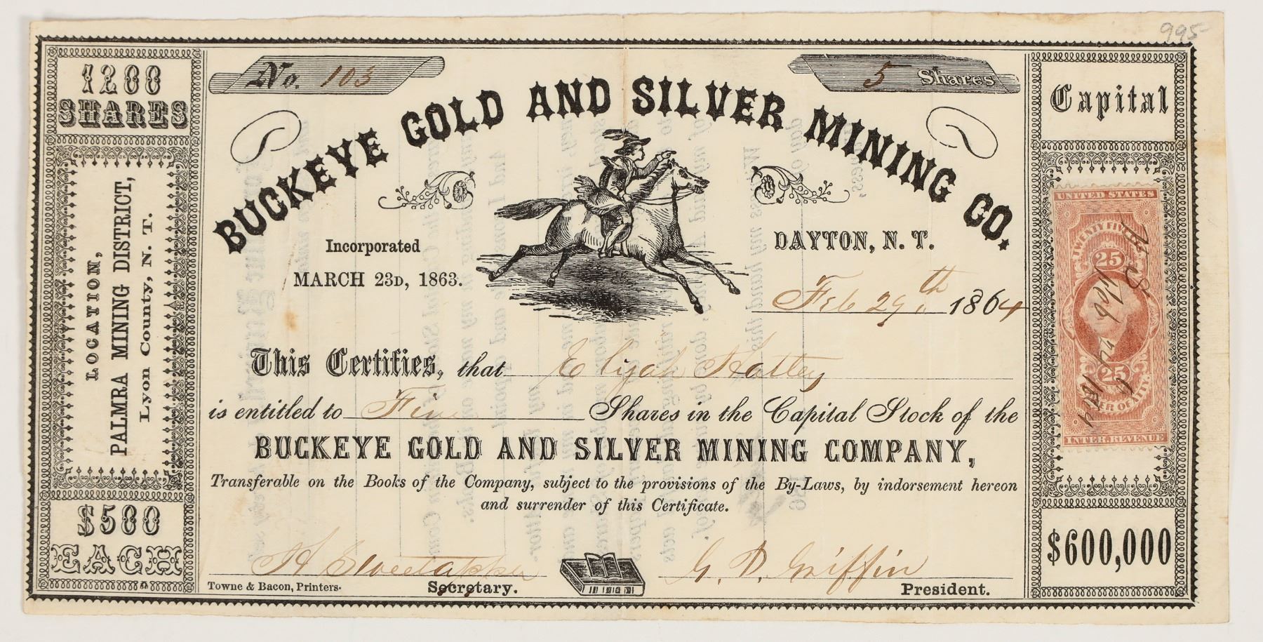 Buckeye Gold & Silver Mining Co. Stock Certificate, Nevada Territory, 1864 [205257]