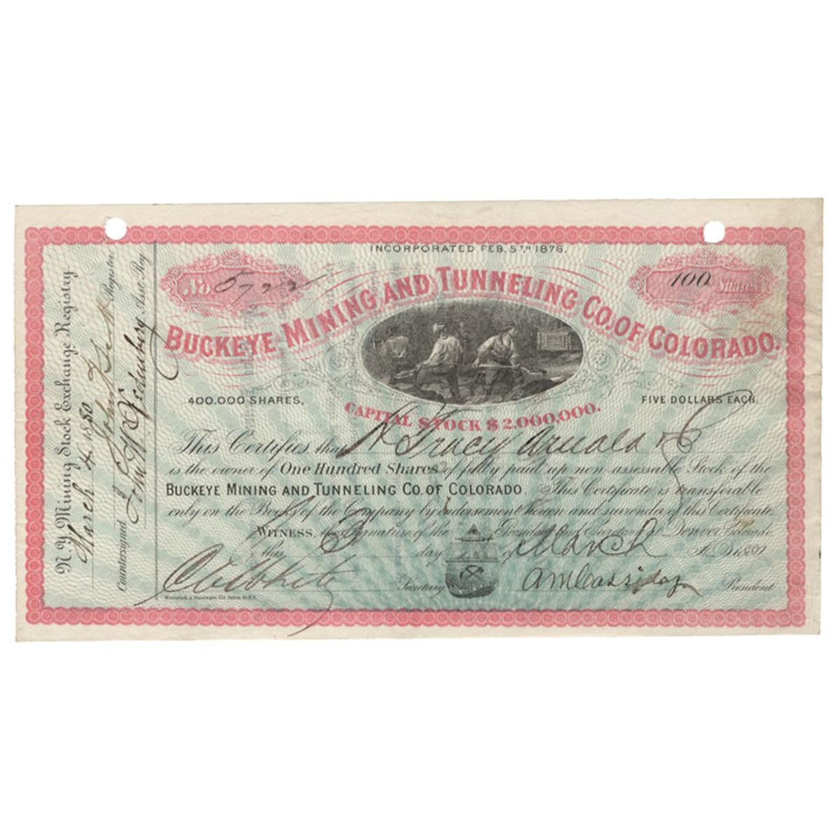 1880, Denver, Colorado. Stock certificate for 100 shares. Pink/Green/Black. Vignette of miners at work. Litho. Pretty. Mines were located at Silver Cliff. Two file holes in upper left corner. Uncancelled and Fine.