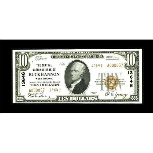 <B>Buckhannon, WV</B></I> - $10 1929 Ty. 2 <B>The Central NB</B></I> Ch. # 13646<BR>This bright and pack fresh <B>Choice Crisp Uncirculated</B></I> $10 Type 2 is from one of the few West Virginia banks available this nice. The paper surfaces are of unquestionable Gem quality, a grade we hesitated to certify due to the narrow bottom margin at left.<BR><BR><b>Shipping:</b> Coin/Currency (<a target="_blank" href="http://www.heritageauctions.com/common/shipping.php">view shipping information</a>)