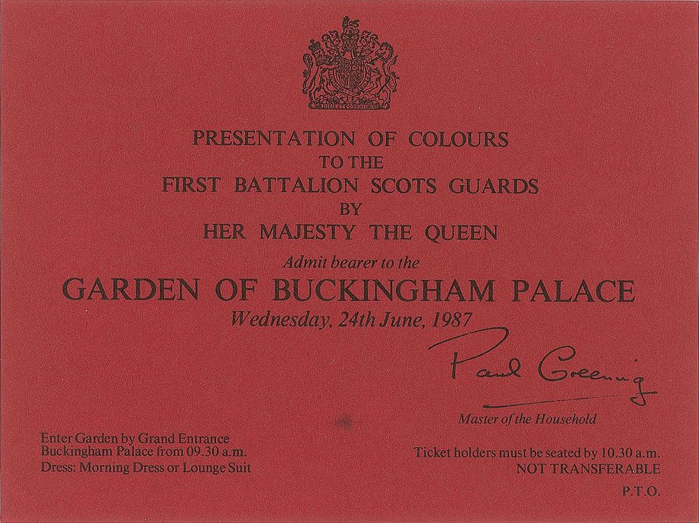 Original red 6 x 4.5 ticket for the "Presentation of Colours to the First Battalion Scots Guards by Her Majesty the Queen," held at the Garden of Buckingham Palace on June 24, 1987, noting that all ticket holders must arrive between 9:30 and 10:30 a.m., and that their attire consist of "Morning Dress or Lounge Suit." Signed in black ink by Paul Greening as master of the household, with reverse listing information for "Cameras," "Very Wet Weather," and "Seating" for the parade. In fine condition.