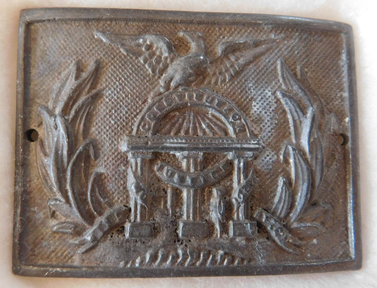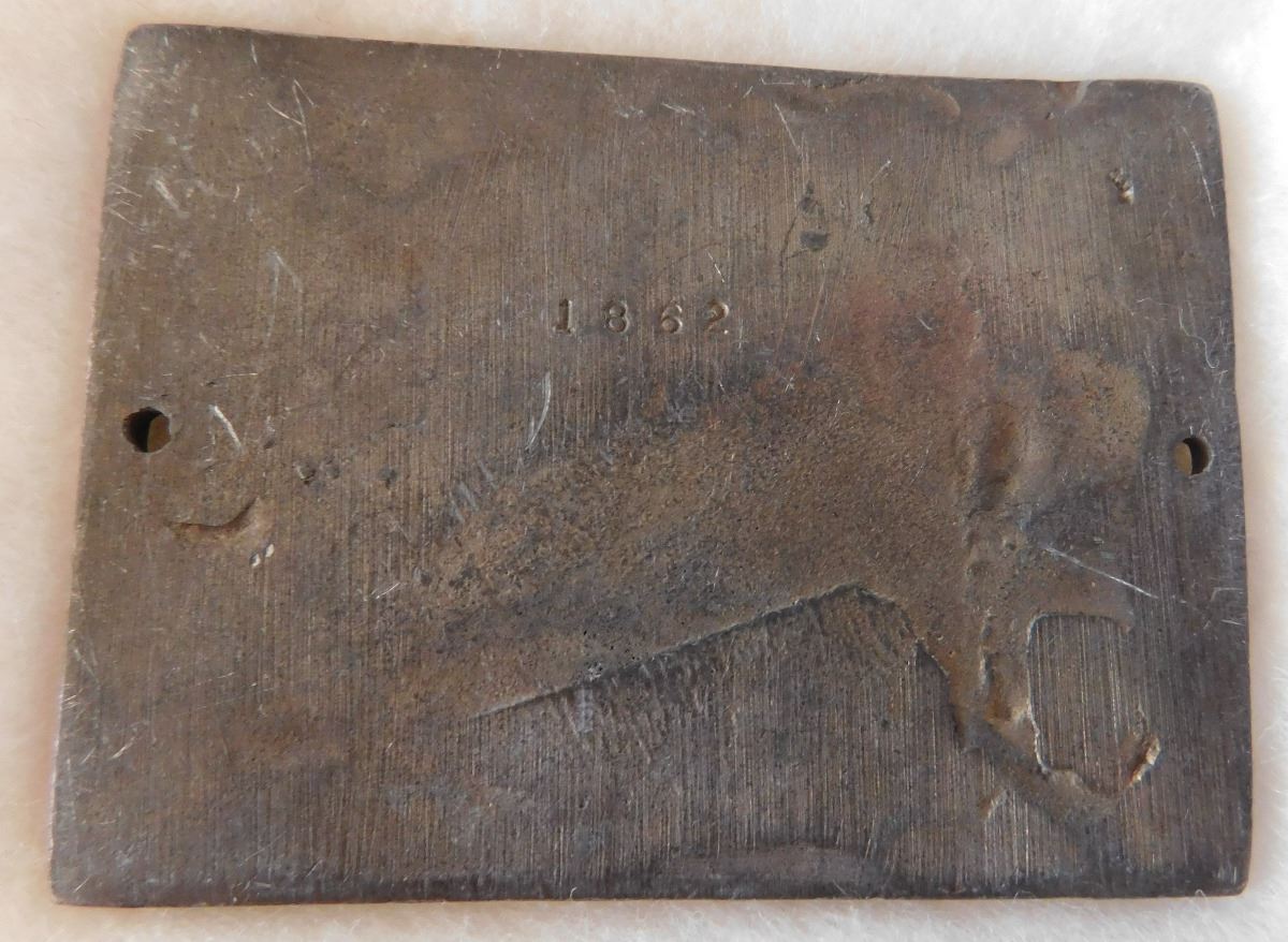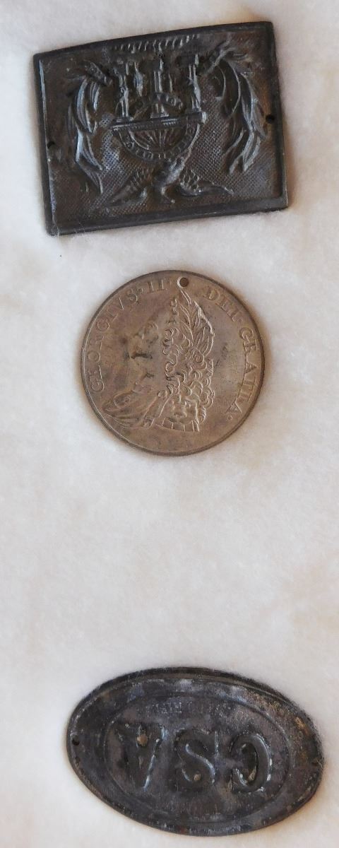 Buckle & Peace Medal Collection, circa 1860s. Made of pewter and nickel silver, the buckle measures 3". Eastern Coast USA. 2 Civil war buckles and a peace medal in lot. Frame not included. Condition: Some patina and wear, see images. Shipping: $22.50.