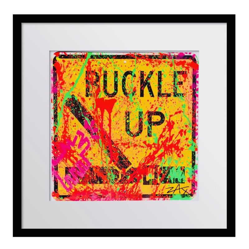 "Buckle Up" is an original hand painted metal street sign by E.M. Zax, hand signed by the artist. This piece comes framed. Includes Letter of Authenticity. Measures approx. 34" x 34" (frame), 24" x 24 (image). The actual paint pattern may vary from the image shown.