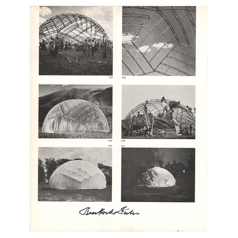 Visionary American architect, inventor, writer, and philosopher (1895-1983) perhaps best known for inventing the geodesic dome, one of the signal developments in modern design and engineering. Very appealing 8 x 10.25 book photo containing images of six installations of a geodesic dome, signed in the lower border in black felt tip by Buckminster Fuller. In fine condition.