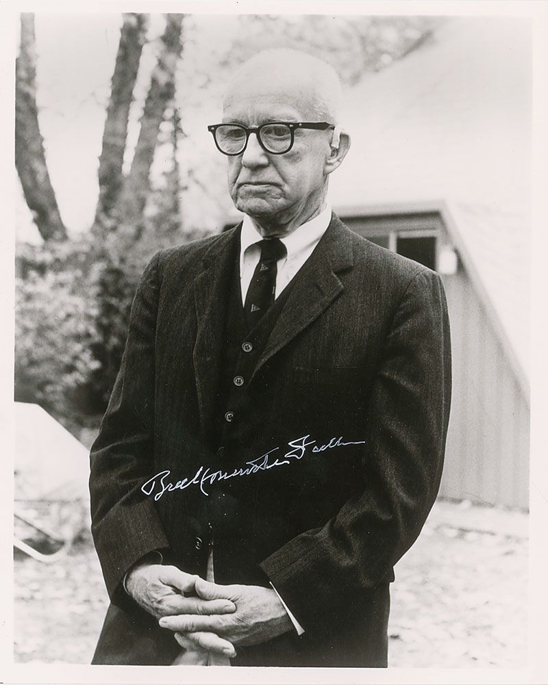 Visionary American architect, inventor, writer, and philosopher (1895–1983) perhaps best known for inventing the geodesic dome, one of the signal developments in modern design and engineering. Glossy 8 x 10 photo, signed in white ink. In fine condition, with some light curling to vertical edges.