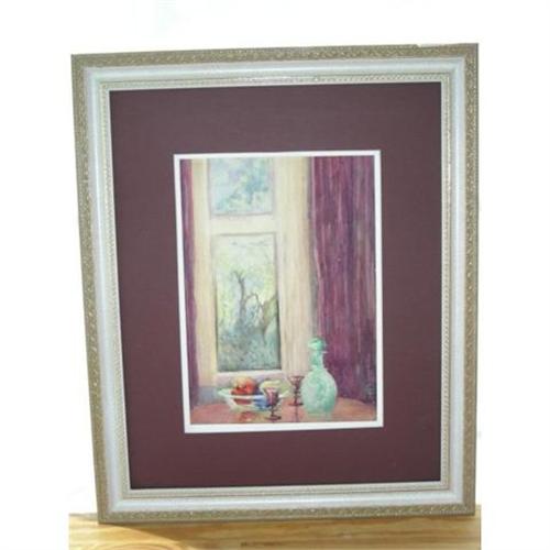 TITLE: Water Color Painting on Board E M Freemantle Greensways 1920 Bucks County Pennsylvania Art<p>DESCRIPTION: 1920 water color interior still life.of with curtain and bottle..<p>SIGNED: Label reads "Chatterymoor dining room, E M Freemantle Greenways, PENN Bucks" and initials on lower right of painting.<p>: SIZE: 10 inches x 14 inches<p> CONDITION: Very good frame and painting.<p> :