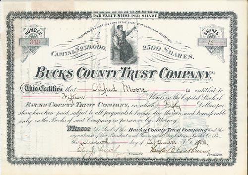 1902, Pennsylvania. Stock certificate for 15 shares. Black. Vignette of seated female allegorical figure at top center. Revenue stamps on back. Very fine.