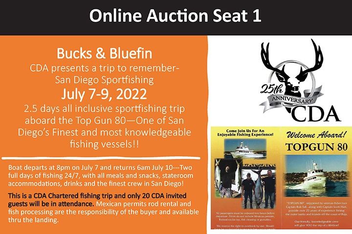 This exciting two-and-one-half-day trip for one person will be aboard one of San Diego's finest charter boats. The Top Gun 80 will be sailing on the evening of July 7th and returning early on July 9th. This trip is an all inclusive trip, with all meals and snacks and drinks included. CDA has charted the entire 25 passenger boat. 24/7 fishing for Bluefin tuna and other notable game fish! Buyer is required to be at the landing on time, or risk missing the trip. No refunds will be granted. for a missed vessel departure. Buyer is repsonsible for fish processing and transport.