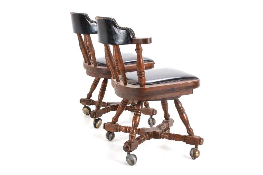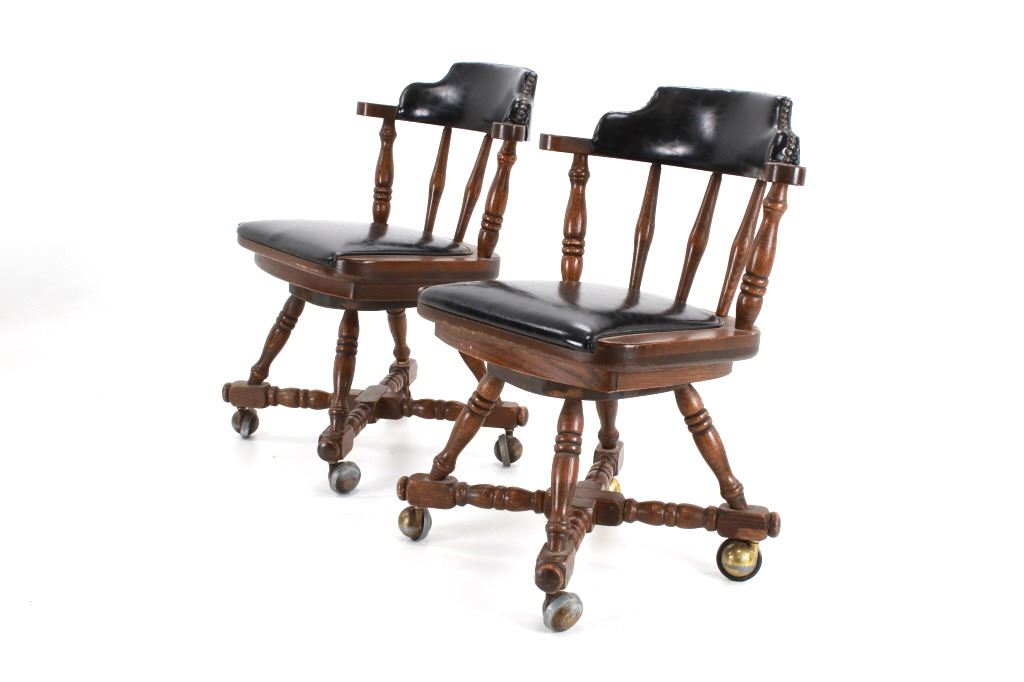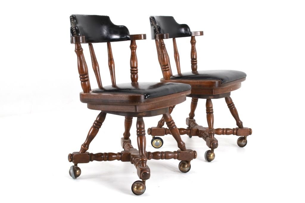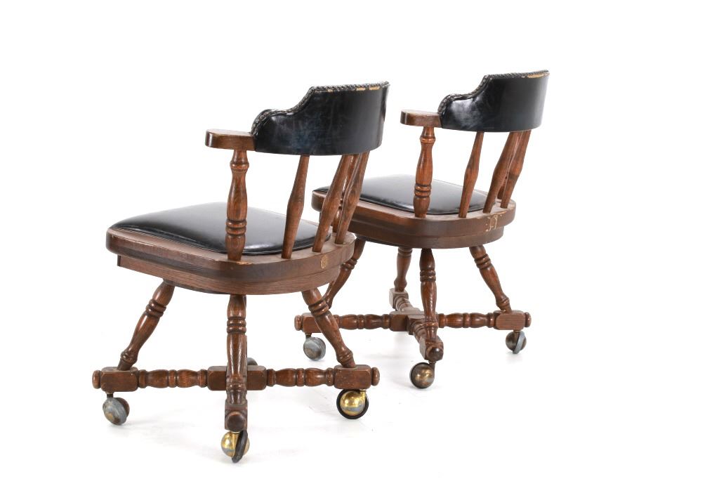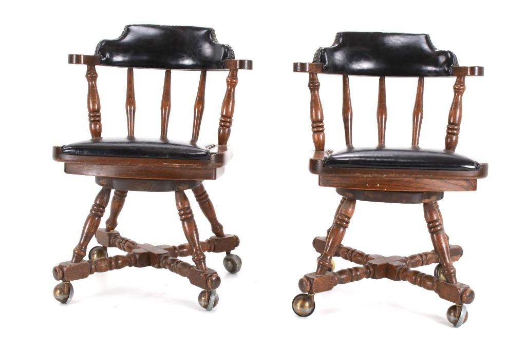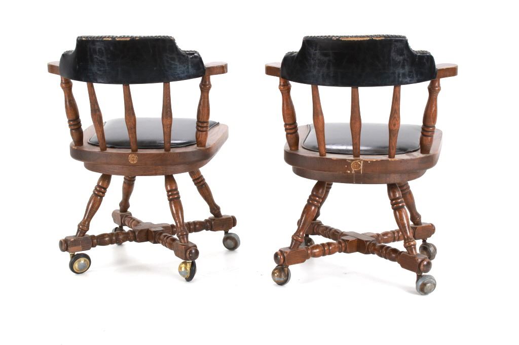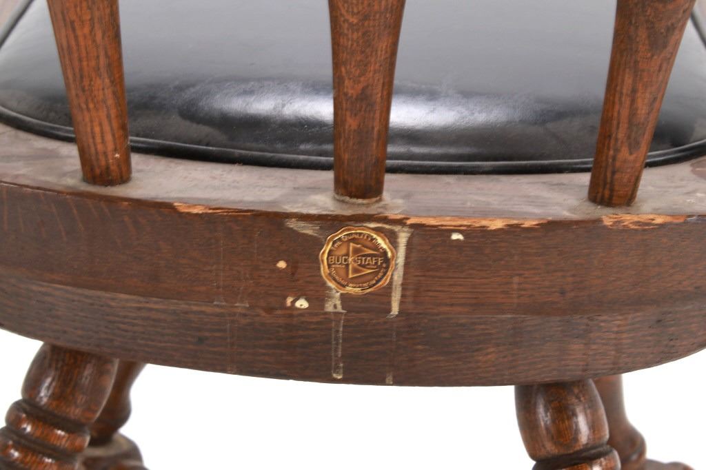 Featured in this lot is this Buckstaff oak rotating chair pair circa 1950's. The chairs in this collection are wonderfully and professionally crafted oak and naugahyde construction that shows two chair's both rotating with a mid century style legs with sphere banded wheels. The chair's feature naugahyde cushions and seat backing that show brass tacks. Each chair is marked with a tag on the backs of the chair's as follows: The Quality Kind - Buckstaff - Since 1850 - Qshkosh, Wisconsin 54901. The condition of this pair of Buckstaff oak chairs is good with some wear tot he wood and to the tags on the back with some minor wear to the naugahyde cushions but otherwise shows good overall condition. The measurements of this pair of chairs is 29 1/2" x 21 1/2" x 19 3/4".