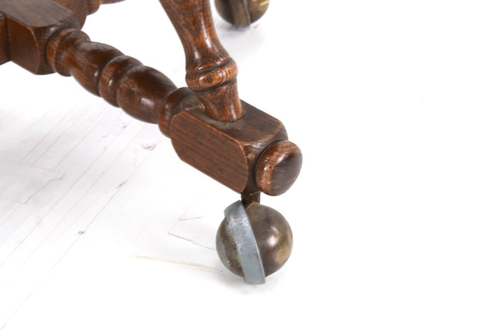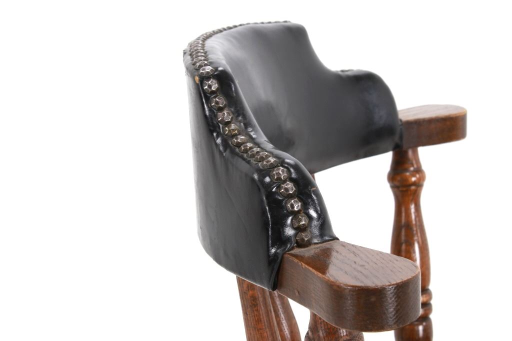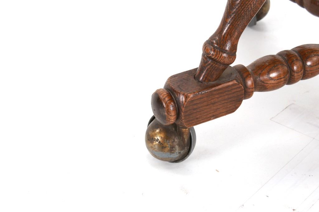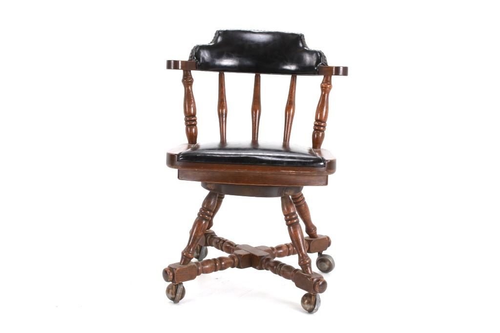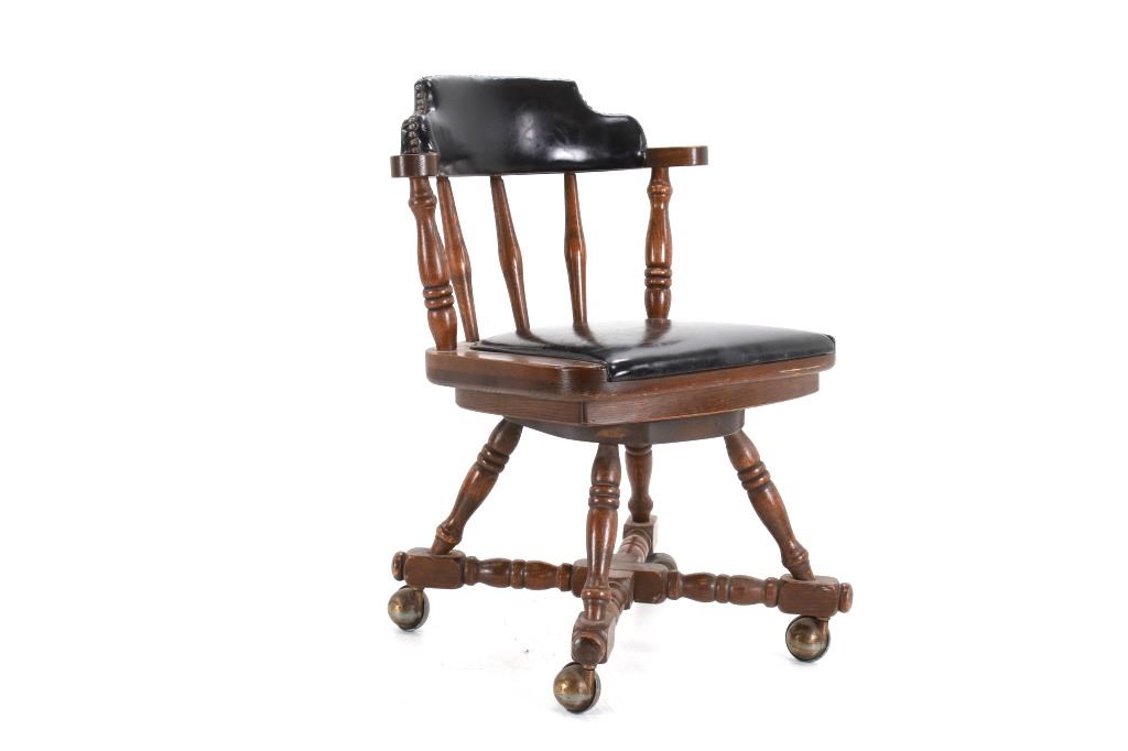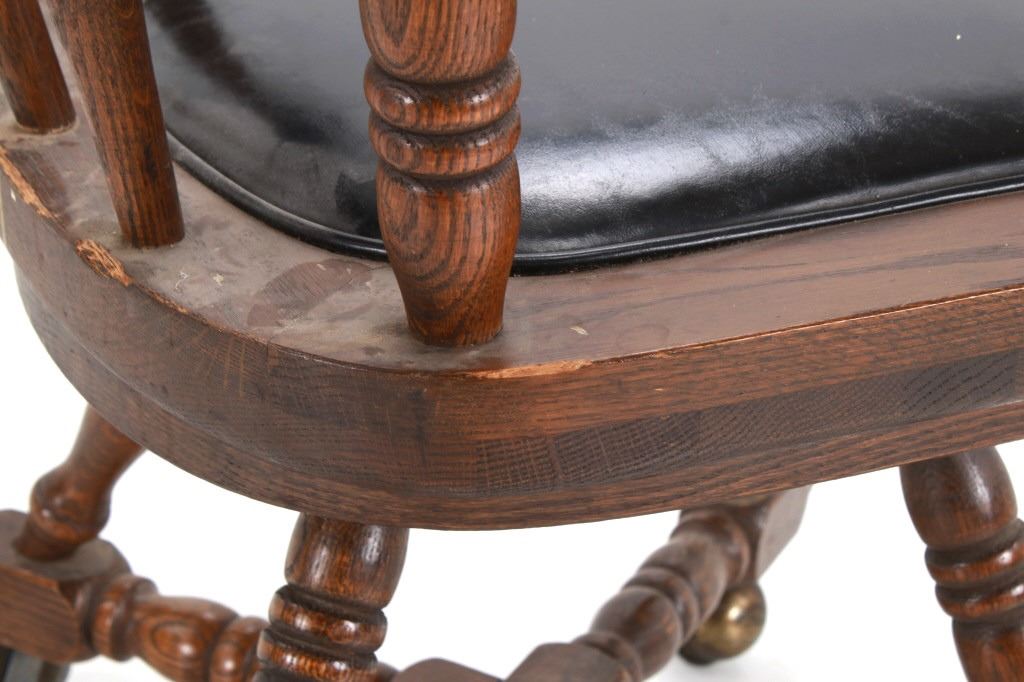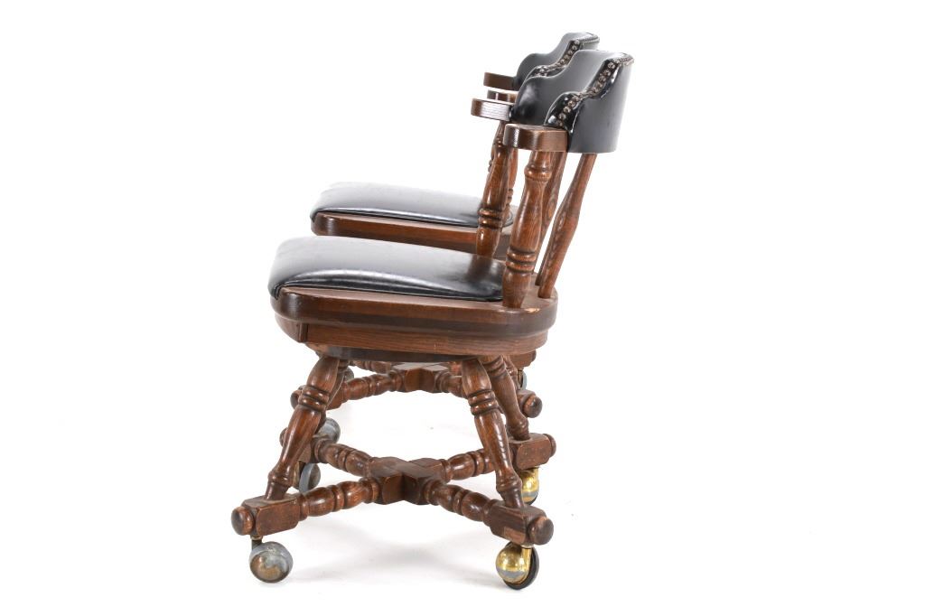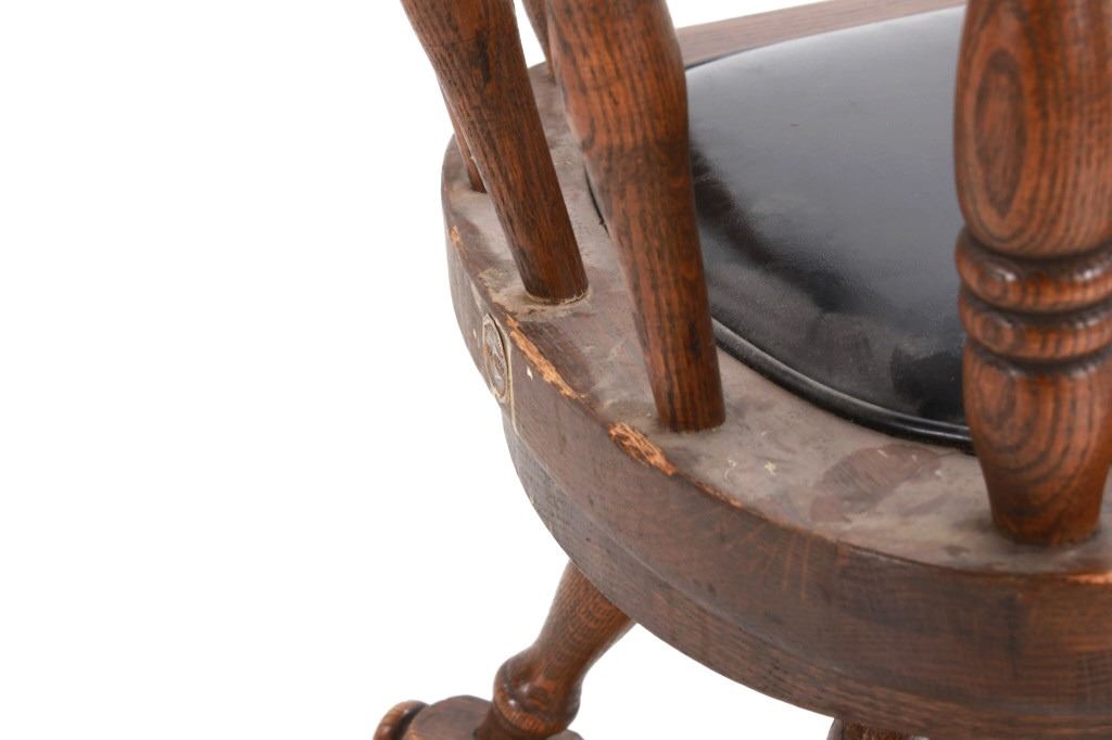 Featured in this lot is this Buckstaff oak rotating chair pair circa 1950's. The chairs in this collection are wonderfully and professionally crafted oak and naugahyde construction that shows two chair's both rotating with a mid century style legs with sphere banded wheels. The chair's feature naugahyde cushions and seat backing that show brass tacks. Each chair is marked with a tag on the backs of the chair's as follows: The Quality Kind - Buckstaff - Since 1850 - Qshkosh, Wisconsin 54901. The condition of this pair of Buckstaff oak chairs is good with some wear tot he wood and to the tags on the back with some minor wear to the naugahyde cushions but otherwise shows good overall condition. The measurements of this pair of chairs is 29 1/2" x 21 1/2" x 19 3/4".