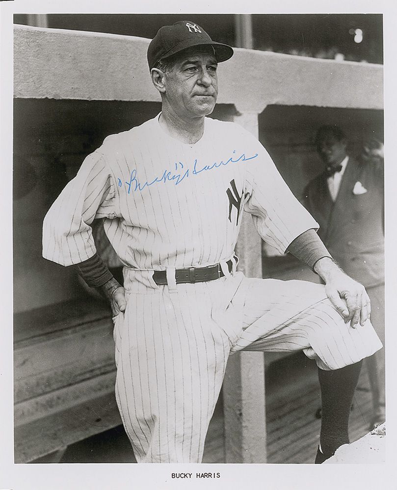 Glossy 8 x 10 photo of Harris in the Yankees dugout, signed in blue ballpoint. In fine condition.