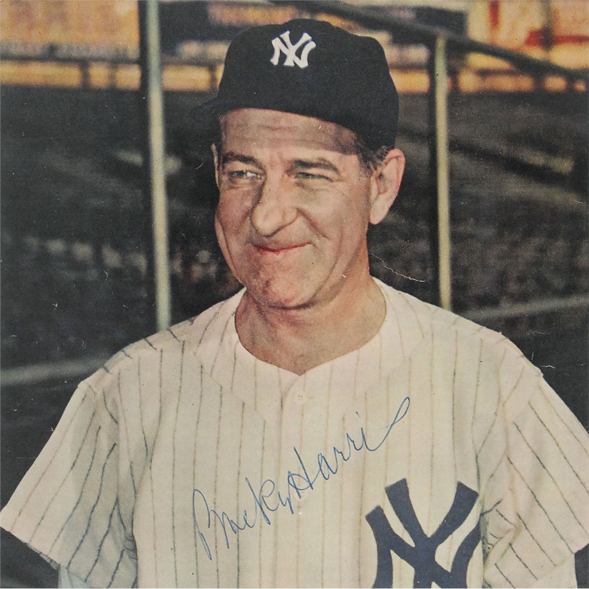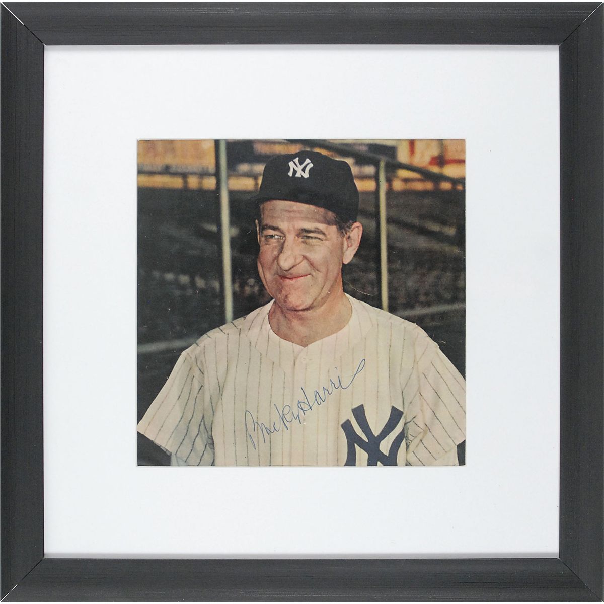 Baseball Hall of Famer (1896–1977) known especially for his time as a player and manager for the Washington Senators. Color 7.5 x 7.5 magazine photo of Harris during his managerial stint with the New York Yankees, prominently signed across his chest in blue ballpoint. Matted and framed to an overall size of 13.75 x 13.75. In fine condition, with a surface crease above his shoulder. Consignor notes that this was signed in person in Chicago during the early 1950s; color photos from this era are infrequently seen, and Harris is uncommon in this format.