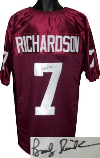 Bucky Richardson played collegiality at Texas A&M and made an immediate impact as a freshman coming off the bench and making his first appearance for the Aggies against Southern Miss and future NFL star Brett Favre, Richardson led the Aggies to a road victory in Jackson when he broke away in the fourth quarter on an 82-yard touchdown. In the Cotton Bowl Classic that same season against Notre Dame. Richardson was named MVP after leading the Aggies to a come from behind victory in the 2nd half. Richardson was also an All-Southwest Conference pick his senior season in 1991, leading the Aggies with 1492 passing yards. He finished in 10th place in the Heisman Trophy voting that year. During his Texas A&M career, Richardson rushed for 2,095 yards, a conference record for QBs. He played in three bowl games with the Aggies and led them to two SWC Championships. He finished his Aggie career 24-6-1 as a starter. Bucky Richardson has hand signed this Texas A&M Aggies Maroon Custom Jersey. Certificate of Authenticity from Athlon Sports.