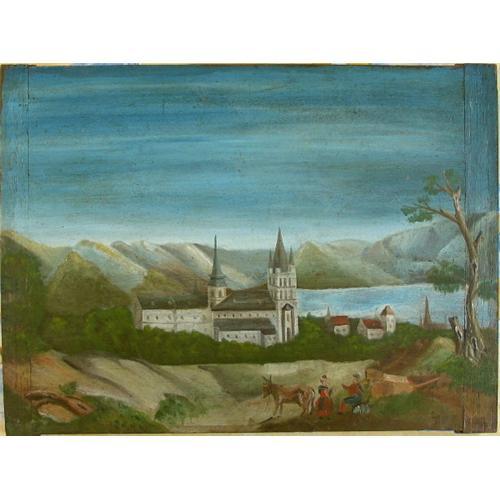 We came across this painting at a market in Brussels and were immediately taken by its naif depiction of a French/Belgian landscape. The painting, which dates from the mid 19thC, is very charming and features in the foreground two country people. In the background, there is a beautiful scene with a chateau, a small village and a lake. The painting is signed on the back "J. Bridault". It is unframed and measures approximately 9.25" high x 12.5" wide.