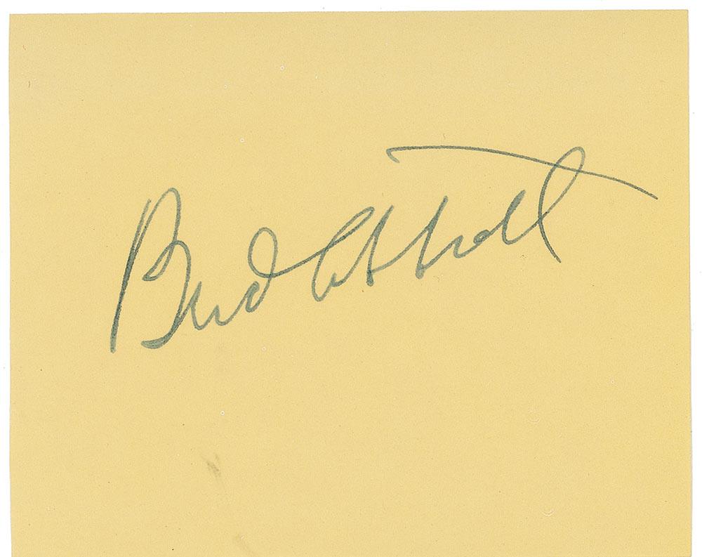 Vintage fountain pen signature, “Bud Abbott,” on a yellow 4.25 x 3.25 slip. In fine condition.