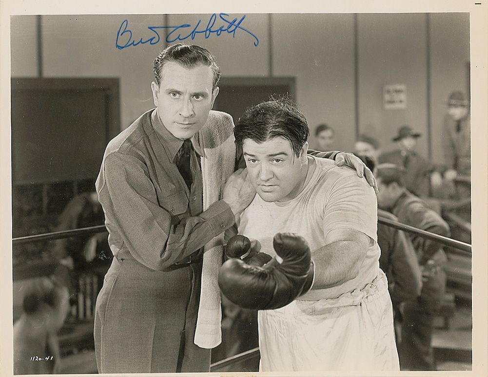 Glossy 10 x 8 photo of Abbott coaching Lou Costello in a boxing ring in Buck Privates, signed in blue felt tip. In very good condition, with scattered creases and impressions from typed notation on reverse.