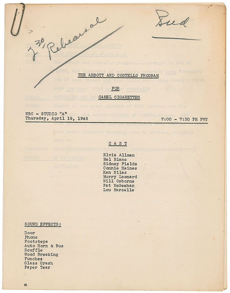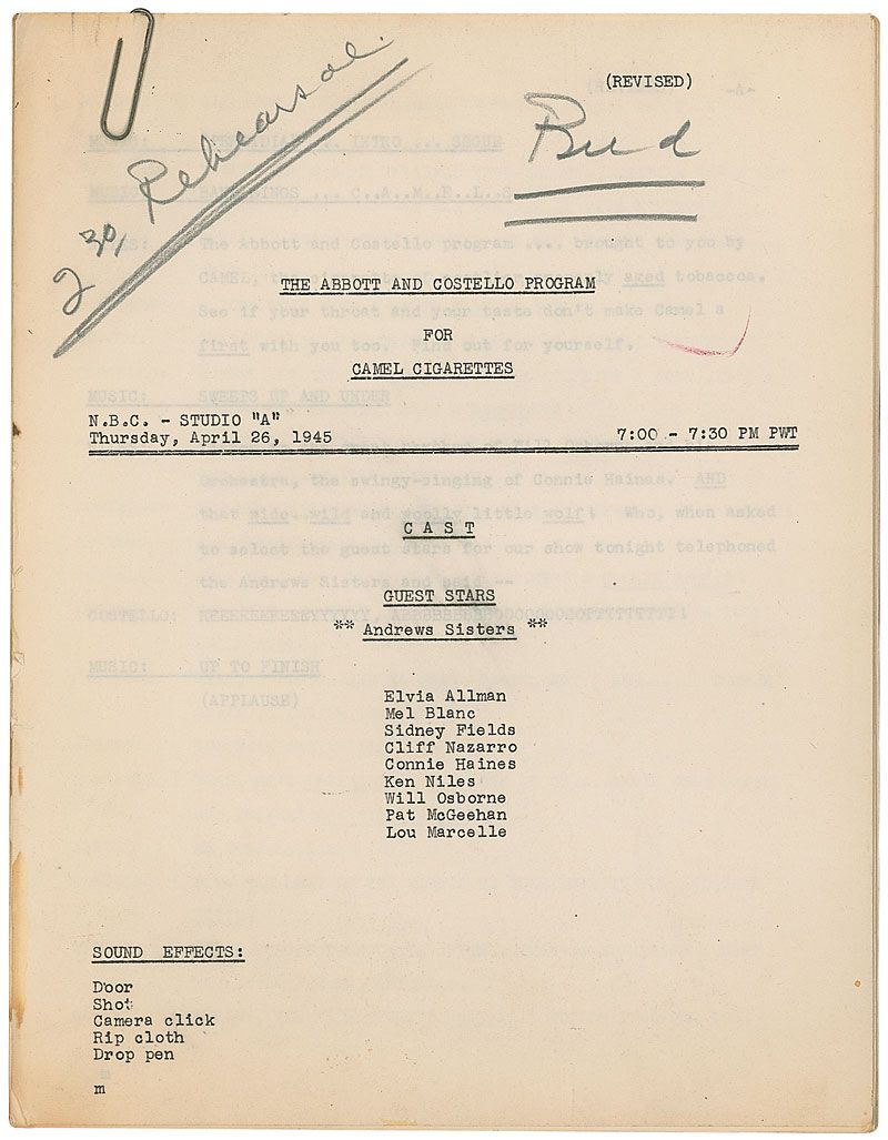 Two original unsigned scripts issued to Bud Abbot for episodes of The Abbott and Costello Program, 8.5 x 11, dated April 19 and 26, 1945, including one episode starring the Andrews Sisters. Both revised scripts are labeled on the cover in pencil, “2:30 Rehearsal,” and “Bud.” In fine condition, with expected light handling wear.
