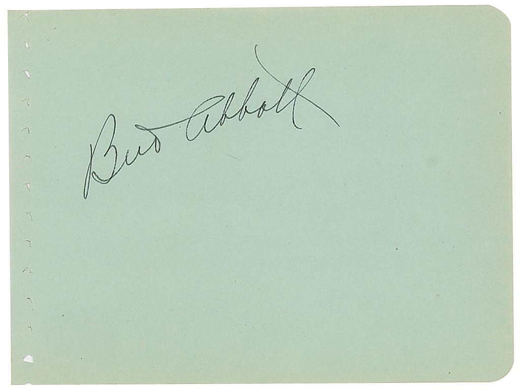 Vintage ballpoint signature, "Bud Abbott,” on a green 6 x 4 album page. In fine condition.