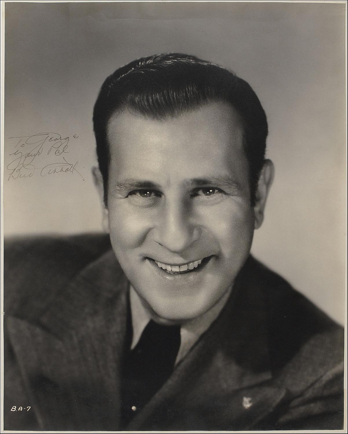 Huge vintage matte-finish 15.75 x 19.75 head-and-shoulders publicity photo of Abbott smiling pleasantly, signed and inscribed in fountain pen “To George, Your pal, Bud Abbott.” In fine condition, with some mild rippling to horizontal edges, and a couple minor creases to background. Accompanied by a similar-size matte-finish photo of Lou Costello, bearing a secretarial signature and inscription to George, and also rating otherwise fine.