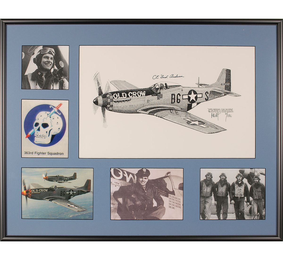 Triple ‘ace’ in World War II. Limited edition 16.5 x 10.5 print of a North American P-51D Mustang, numbered #22/1000, signed in black felt tip, “CE ‘Bud’ Anderson.” Also signed in felt tip by the artist, Joe Milich. Matted and framed with five photos to an overall size of 26.75 x 21. In very fine condition. Oversized.