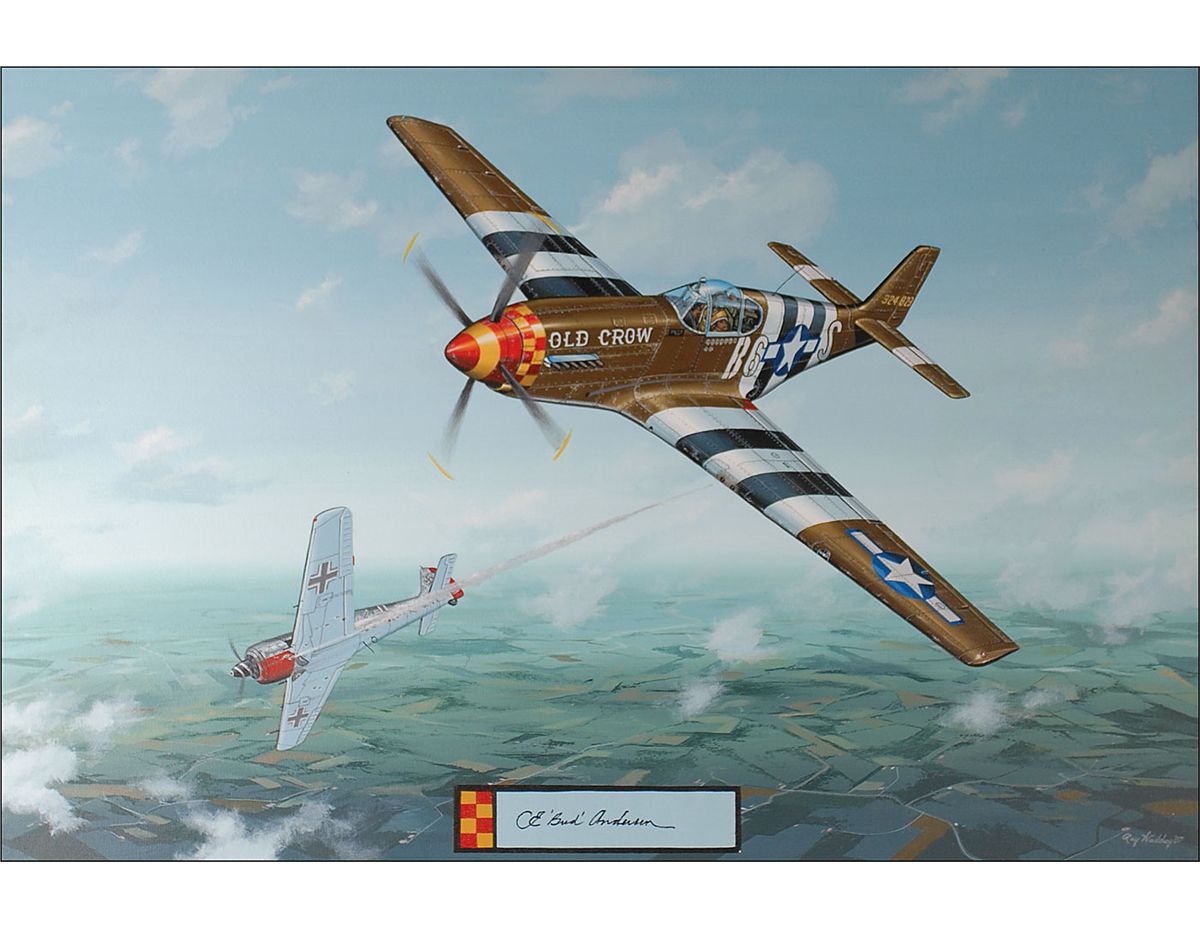 Felt tip signature, “CE ‘Bud’ Anderson,” on a painted 8.25 x 2 card. Card is affixed to an original Raymond Waddey acrylic painting of Anderson piloting his Old Crow away from a downed German fighter, canvas stretched over a wooden frame, 36 x 24, and is signed in paint by Waddey. In fine condition.