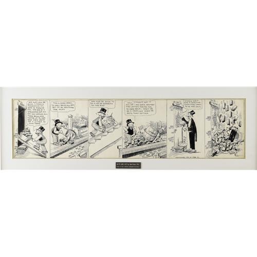 <B>Bud Fisher - Mutt and Jeff Daily Comic Strip Original Art (Star Co., 1912).</B></I> Historians and collectors take note -- this is one of the earliest <I>Mutt and Jeff</B></I> originals known to exist! At one time, it was housed in the collection of Murray A. Harris and a COA to that effect is included with this lot. This daily has an image area that measures approximately 27" x 7", and the art is in Excellent condition. <I>From the Estate of Bruce Hamilton.</B></I> <BR><BR><B>Important notice:</B> Heritage usually auctions material at the rate of 200-250 lots per hour. On some occasions eBay Live bid software or the Internet may not be able to keep up with the pace of the auction. We recommend placing a realistic absentee bid now as insurance to avoid disappointment. Occasionally the auctioneer may eliminate or reject an eBay Live bid, and the auctioneer may also reopen a lot after the close of the eBay live bidding (usually because we missed an audience bid), and may reject your bid even if it shows you as the winning bidder. By bidding via eBay Live, you agree that Heritage may award the lot to another bidder at its sole discretion under the circumstances described above or any other reasonable circumstances. Since eBay bids are not shown to us until we open the lot on the floor, we treat those bids just like floor bids. In most cases the floor responds before the eBay bid is presented to us, due to Internet lag time, so for consistency we have made it a policy that floor bids are always considered first over tie eBay live bids. Also please note that all Heritage lots purchased through eBay Live carry a 22.5% Buyer's Premium. Please make sure you read the Terms and Conditions before you bid. This lot is being auctioned in conjunction with a live floor auction by Heritage Auction Galleries. All final auction and invoice information will be supplied by Heritage Auction Galleries, and all other information should be considered preliminary. Lot:41001 <BR><BR><B>Winning Notification and Billing:</B> After the FINAL session in this auction is complete, Heritage will send e-mail and snail mail invoices. This process normally takes several days. All final auction and invoice information will be supplied by Heritage Auction Galleries, and all other information should be considered preliminary. <BR><BR>This auction will be conducted on a live auction floor and over the Internet through eBay Live. If you choose to place an absentee bid, please take a moment to <font color='#0000ff'><u><a href='http://pages.ebay.com/liveauctions/help/before/laabsentee.html'>learn how eBay Live absentee bidding works</a></u></font><font color='#000000'>
